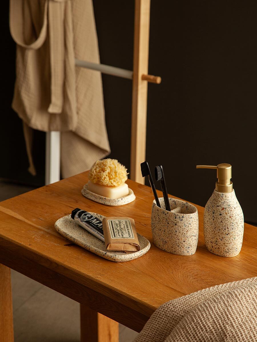 Мыльница Mosaic поможет организовать пространство у раковины и украсит интерьер ванной комнаты. Имитация фактуры натурального камня и нейтральная цветовая гамма делают аксессуар практичным, позволяя легко интегрировать его в различные стилевые решения.