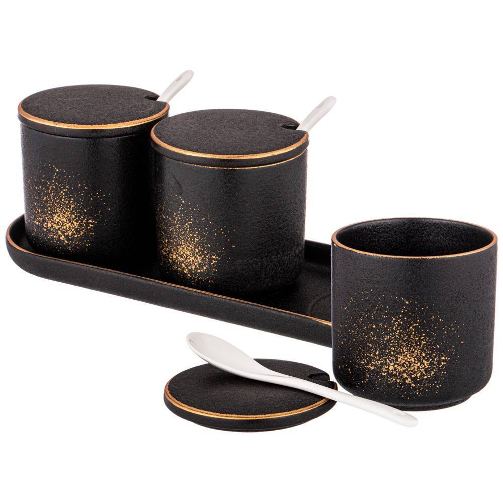 Коллекция "MIDNIGHT GOLD" ТМ BRONCO - это ультрамодная сервировка стола. Черный с золотыми брызгами и окантовкой фарфор. Глубокое матовое покрытие. Каждый предмет коллекции уникален. Тарелки в виде форм для запекания, сковородок, чугунков, элементы поверхности гриль на дне изделий - все это делает Ваш стол неповторимым! Посуда прошла сертификацию. Безопасна для контакта с пищевыми продуктами. С осторожностью использовать изделия в посудомоечной машине и микроволновой печи по причине возможного повреждения золотого декоративного покрытия. Рекомендуется применять мягкие средства для мытья в посудомоечной машине. Комплектность: банка с крышкой и ложкой 8*8 см 250 мл - 3 шт, подставка фарфоровая 27,5*9,5*2 см - 1 шт.