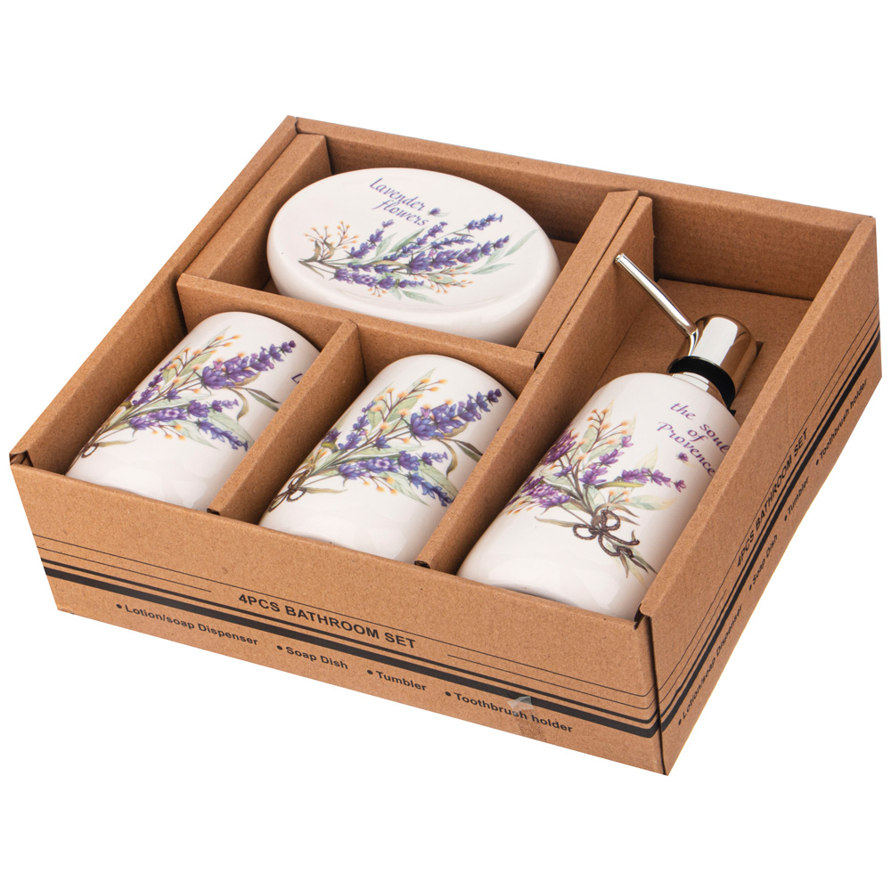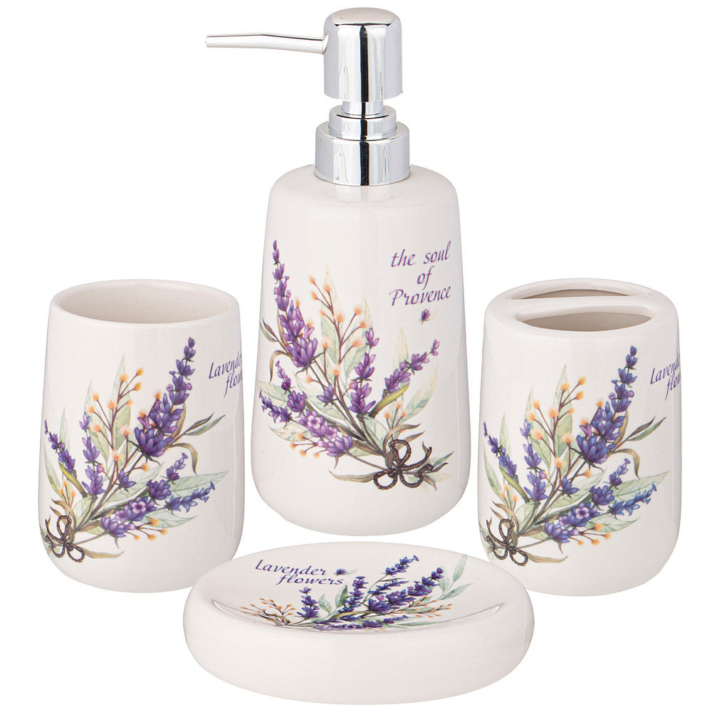 Набор аксессуаров для ванной комнаты состоит из дозатора для жидкого мыла, подставки-стакана, подставки для зубных щёток и мыльницы для кускового мыла.