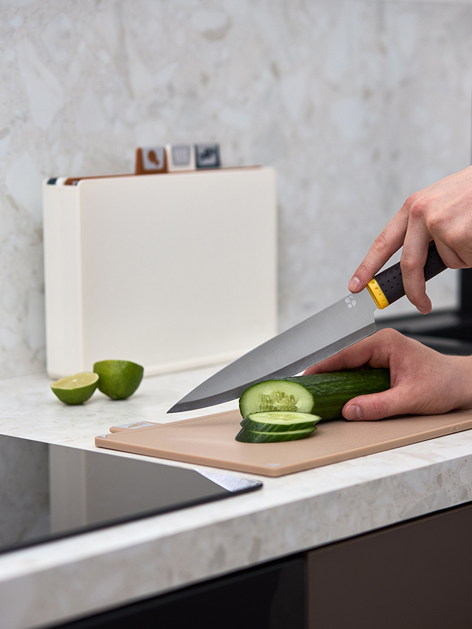 Набор Cut&Store из 5 предметов – идеальное решение для любителей готовить и ценителей порядка на кухне. В комплект входят 4 разделочные доски из полипропилена и специальный держатель для их удобного хранения.