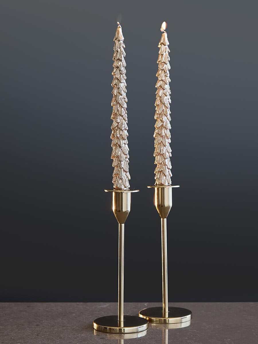 Набор из двух свечей из коллекции New Year Essential создаст волшебную атмосферу праздника. Высокие золотистые елочки идеально подходят для украшения праздничного стола, камина или подоконника.