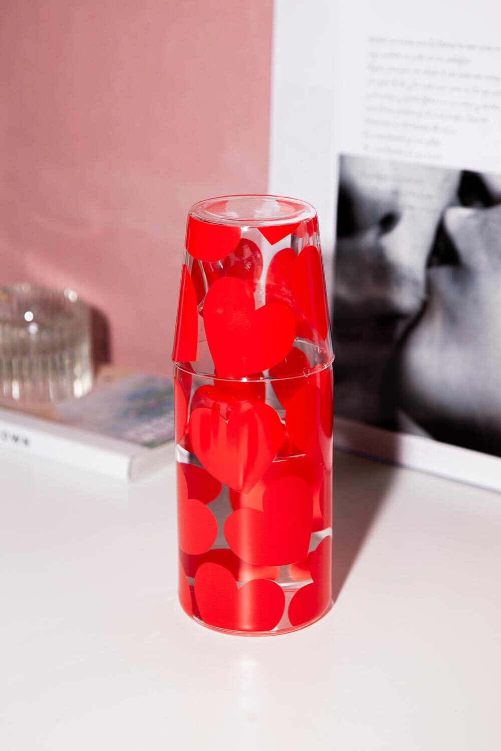 Прозрачное стекло, украшенное россыпью алых сердечек, словно наполняет напиток теплом и эмоциями.