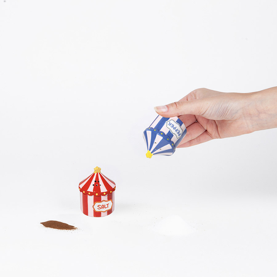 Перенесите магию ярмарочного чуда в свой дом с очаровательным набором из солонки и перечницы из коллекции Funfair в форме ярких полосатых ярмарочных палаток. Их классические бело-алые полосы стремятся ввысь к изящным шпилям, украшенным золотой звездой. Они создают ощущение, что под куполом из керамики находятся самые дорогие сердцу воспоминания.