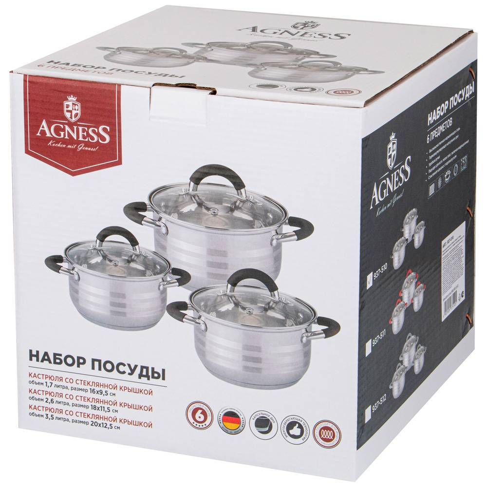 Выбирая набор кастрюль AGNESS - Вы приобретаете комплект самых необходимых и чаще всего используемых кастрюль. Кастрюли AGNESS выполнены из нержавеющей стали с высокими антикоррозионными свойствами.