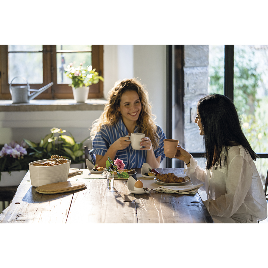 Подставки для яиц выполнены из переработанного пластика. Дизайн изделий напоминает керамику, а реалистичности внешнему виду придают тщательно подобранные пастельные тона и неровные круговые узоры, создающие эффект ручной работы.