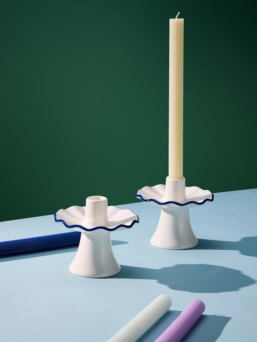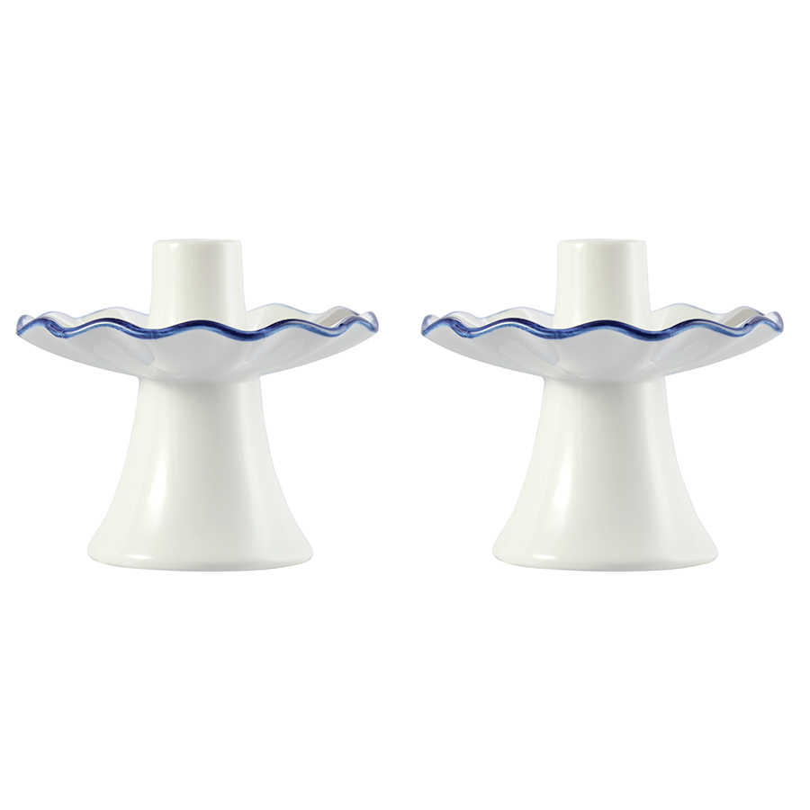 - Акцентная голубая кайма придает белоснежным подсвечникам особую элегантность.