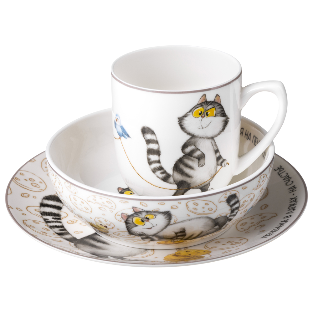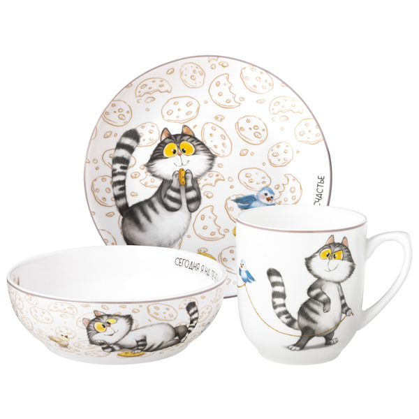 Всем, кто полон энергии и задора, любит кофе и следит за фигурой посвящается коллекция «Счастье есть» от ТМ LEFARD. Это лучший подарок детям, родителям, друзьям и коллегам. Поднимайте настроение вместе с веселым котиком, верьте, Счастье есть! Кружки, наборы посуды, салатники, закусочные и обеденные тарелки выполнены из высококачественного фарфора. Удобные формы и размеры. Красочная упаковка. Продукция прошла сертификацию, безопасна для контакта с пищевыми продуктами. Можно использовать в микроволновой печи, мыть в посудомоечной машине.
