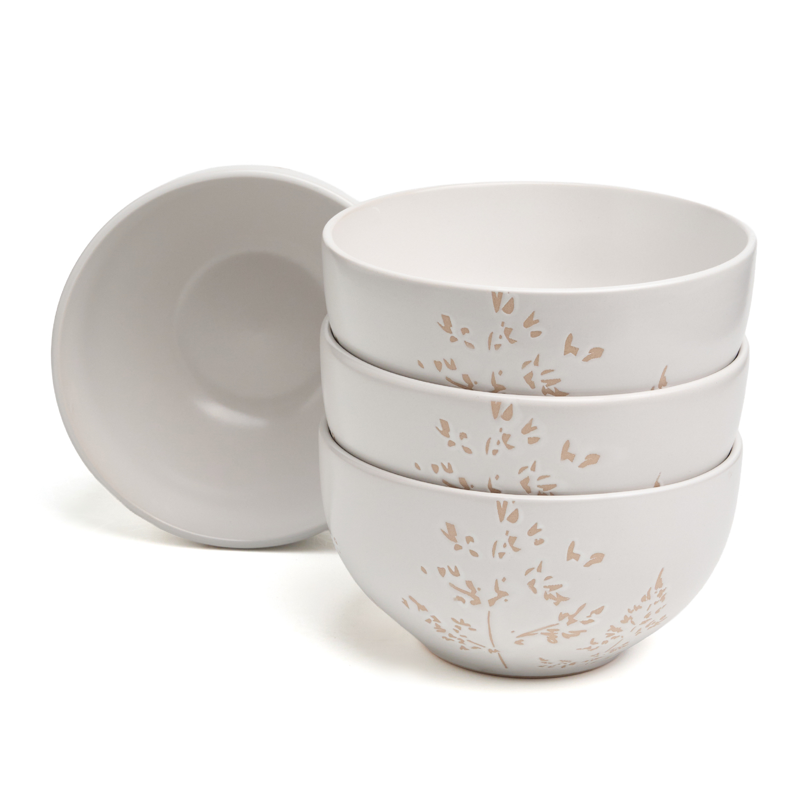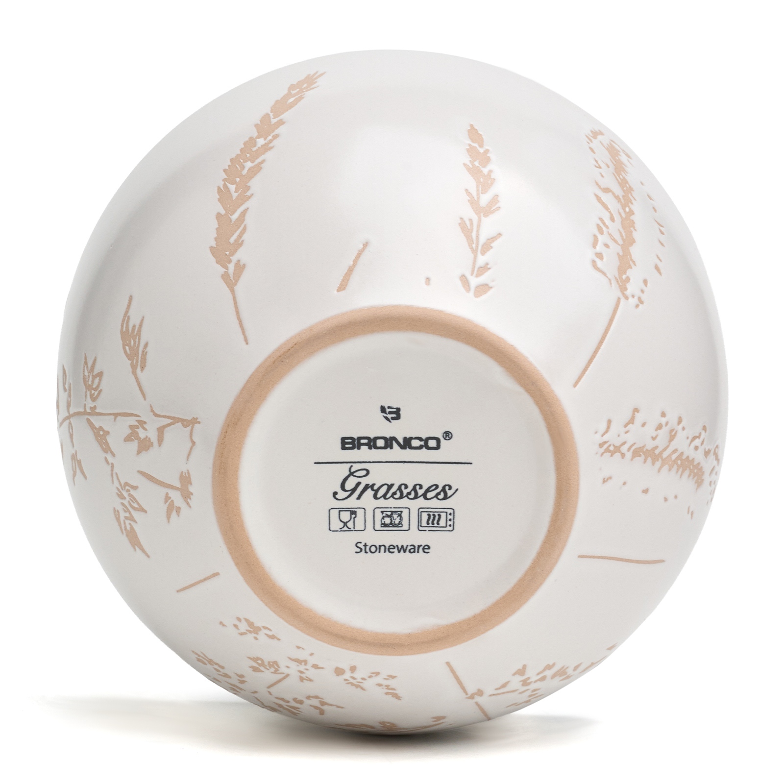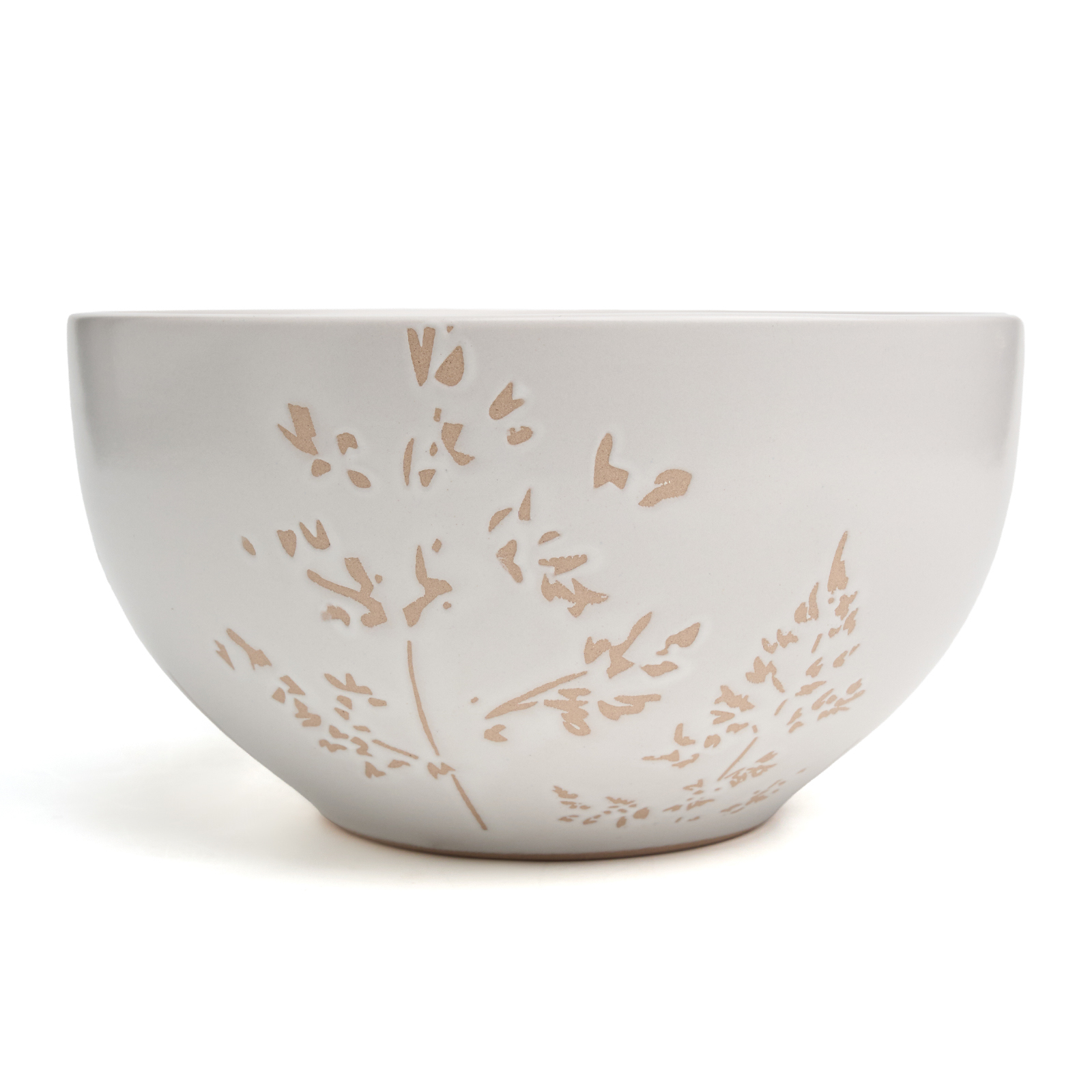 Благодаря сочетанию однотонного фона с красивыми рельефными акцентами в виде трав и цветов, эта посуда удачно впишется в любой интерьер.