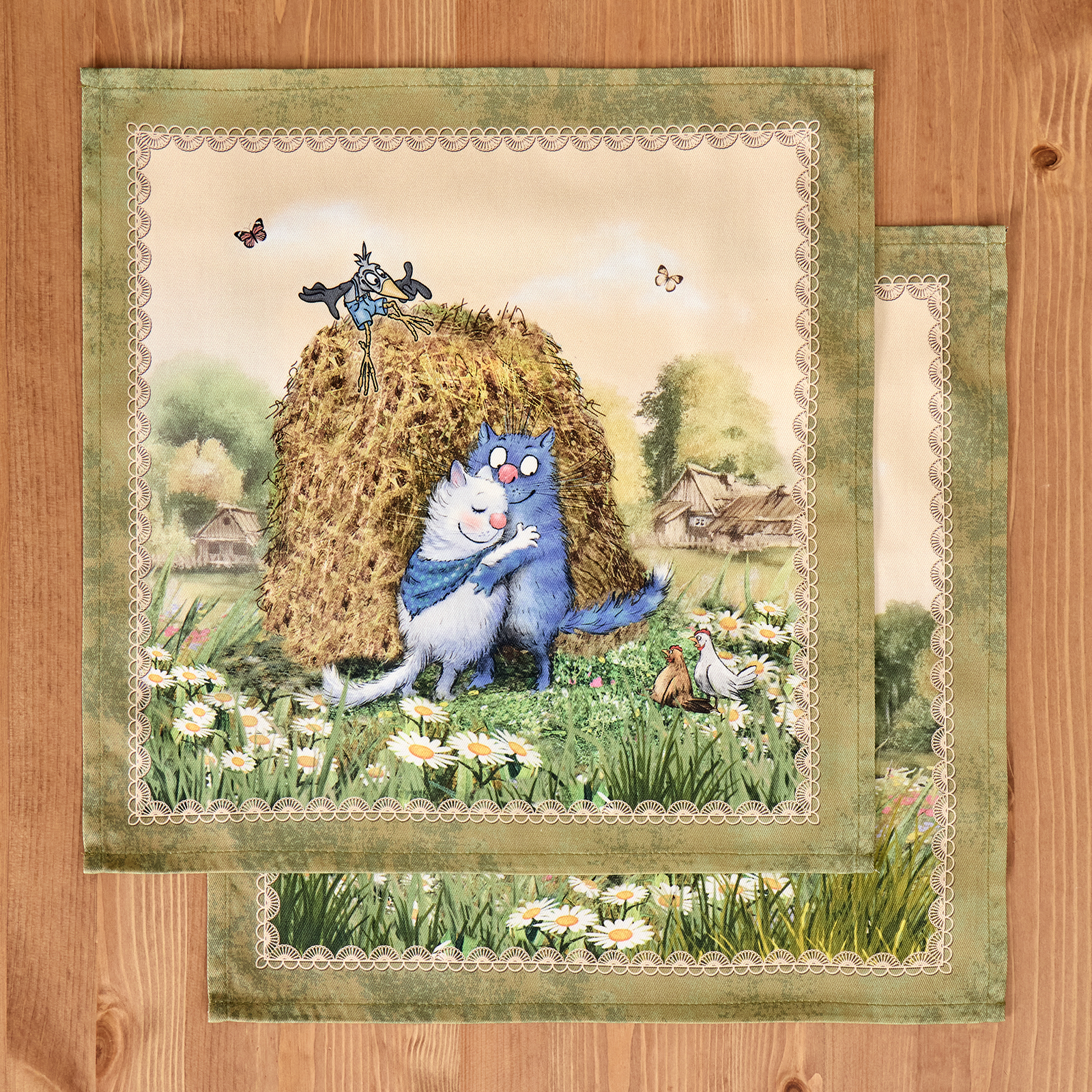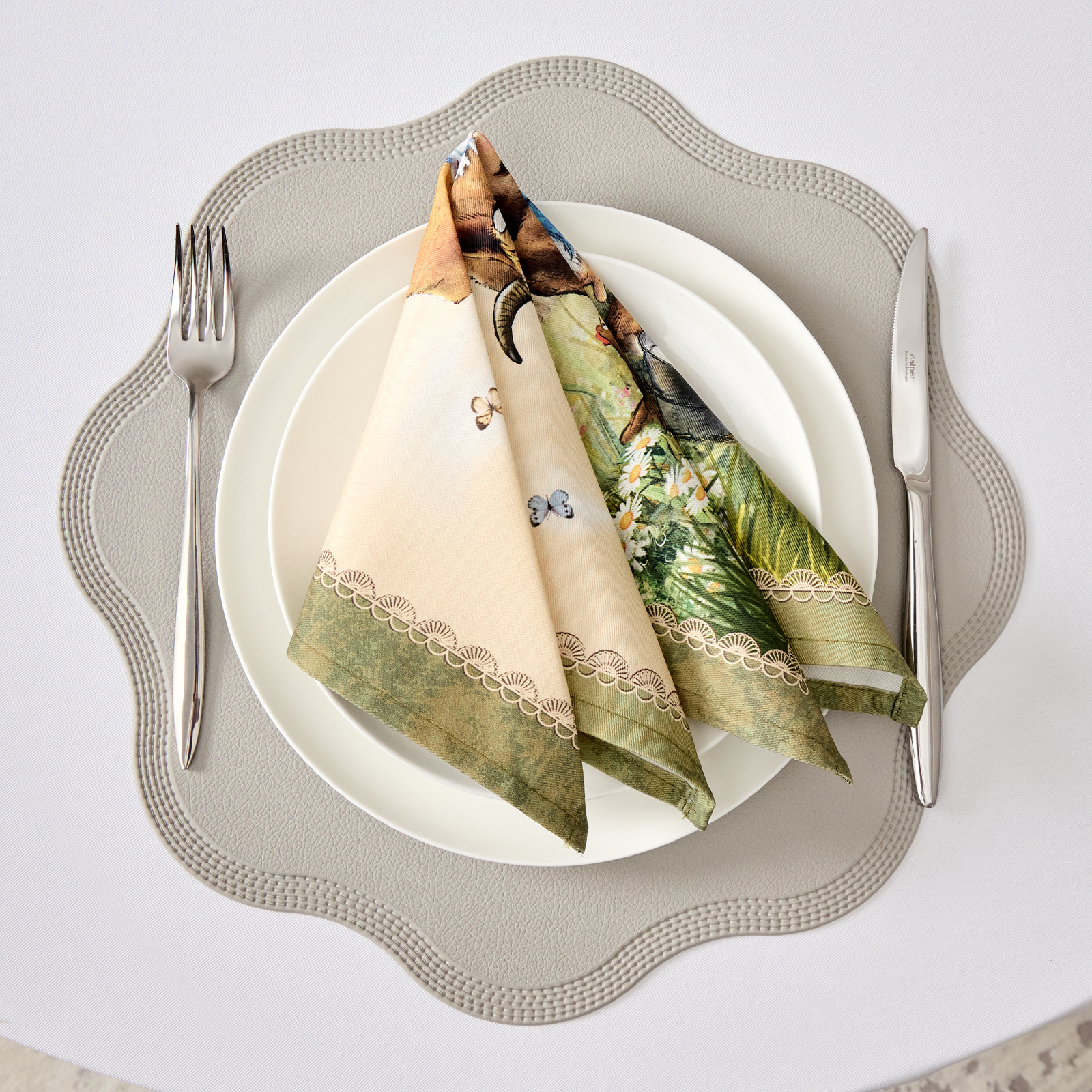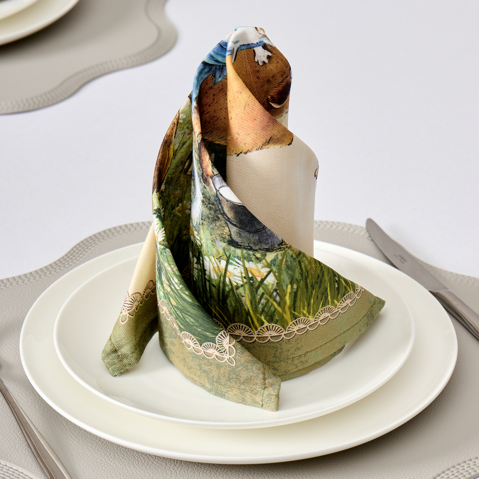 Особым направлением бренда «SANTALINO» является изготовление столового белья (скатерти, салфетки, дорожки (раннер), плейсметы, полотенца, фартуки) по эксклюзивным дизайнам наших художников, воплощённых в цифровой печати, на современном оборудовании. Для пошива изделий используются только натуральные материалы 100% хлопок, плотность ткани составляет 190 гр\м2, она имеет приятную структуру в мелкий рубчик и называется твил, отличается хорошей капиллярностью (впитываемость влаги), драпируемостью, износостойкостью, ткань проходит процесс каландрирования, что делает её более плотной и придаёт лёгкий атласный блеск, предотвращает образование так называемых «катышек» т.е. уменьшается пилингуемость ткани. Цифровая печать позволяет перенести на изделия не только всё богатство красок и оттенков, но и придать особую прочность крашению, ткань не теряет своей яркости даже после 100 стирок. Изделия легки и неприхотливы в уходе, стирать нужно при температуре 40С, гладить при температуре от 110-170С с отпариванием, но нельзя подвергать хлорному отбеливанию. Для удобства эксплуатации на ряд изделий, такие как фартуки, скатерти, дорожки может наноситься водогрязеотталкивающая пропитка, которая не влияет на внешний вид изделия, но позволяет избежать сильного загрязнения при использовании.