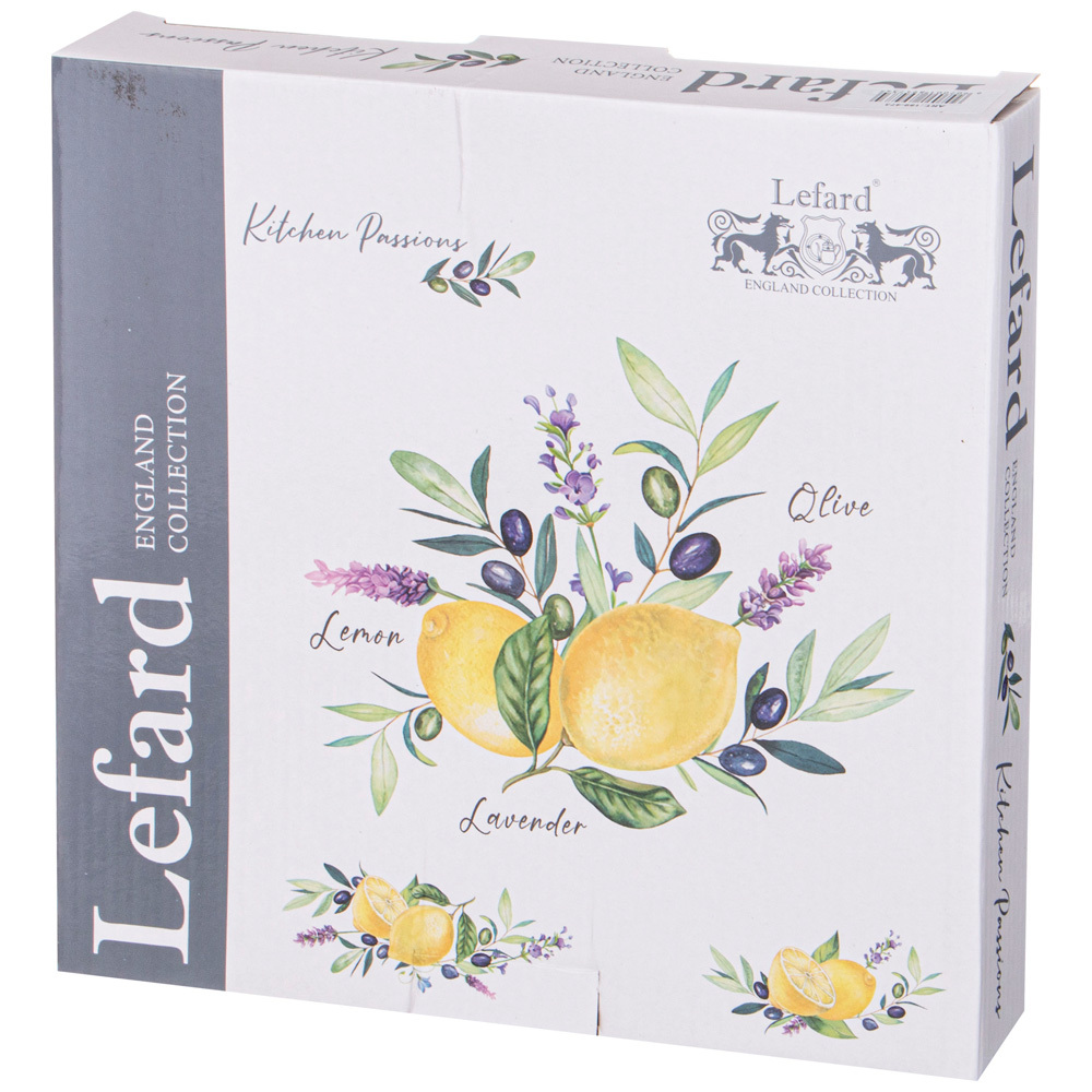 ТМ LEFARD "KITCHEN PASSIONS" предлагает новую коллекцию посуды всем, для кого процесс приготовления стал страстью, кто с удовольствием собирает за своим столом родных и близких и радует их кулинарными шедеврами. Качественный прочный фарфор, гладкая и сверкающая глазурь, новые рельефные формы, удобные и оптимальные размеры тарелок, салатников, чайных пар, любимые дизайны с изображением лимонов, лаванды, оливок, овощей… Яркая упаковка. Отличный подарок. Все изделия прошли сертификацию, безопасны при контакте с пищевыми продуктами. Можно смело мыть в посудомоечной машине, использовать в микроволновой печи.