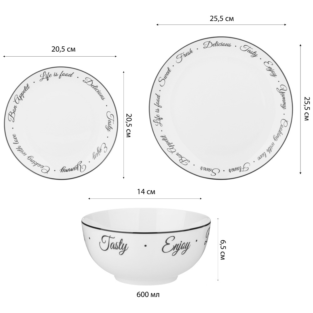 Набор столовой посуды на 6 персон. Посуда TM Lefard серии BON APPETIT. Посуда изготовлена из качественного фарфора. Продукция сертифицирована и безопасна для контакта с пищевыми продуктами. Можно ставить в микроволновую печь и мыть в посудомоечной машине