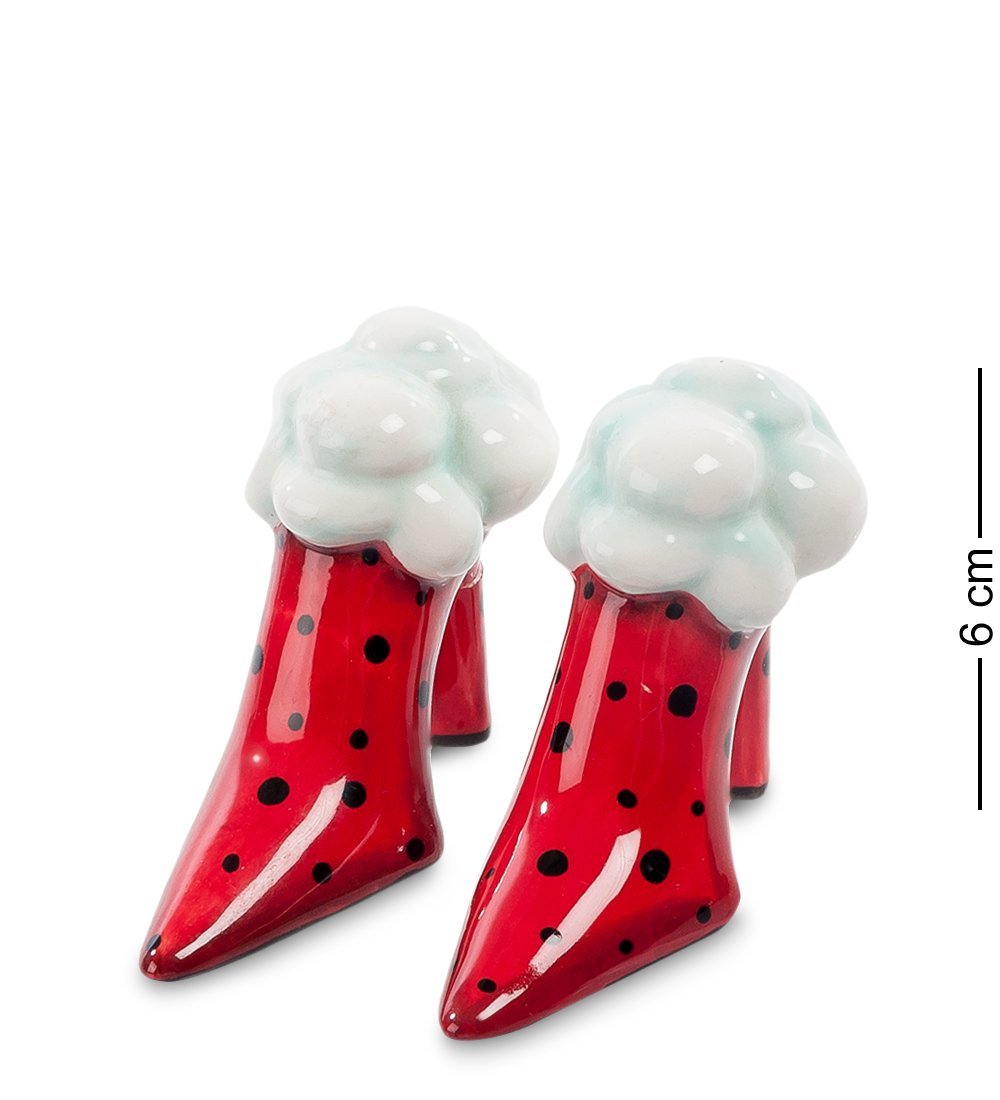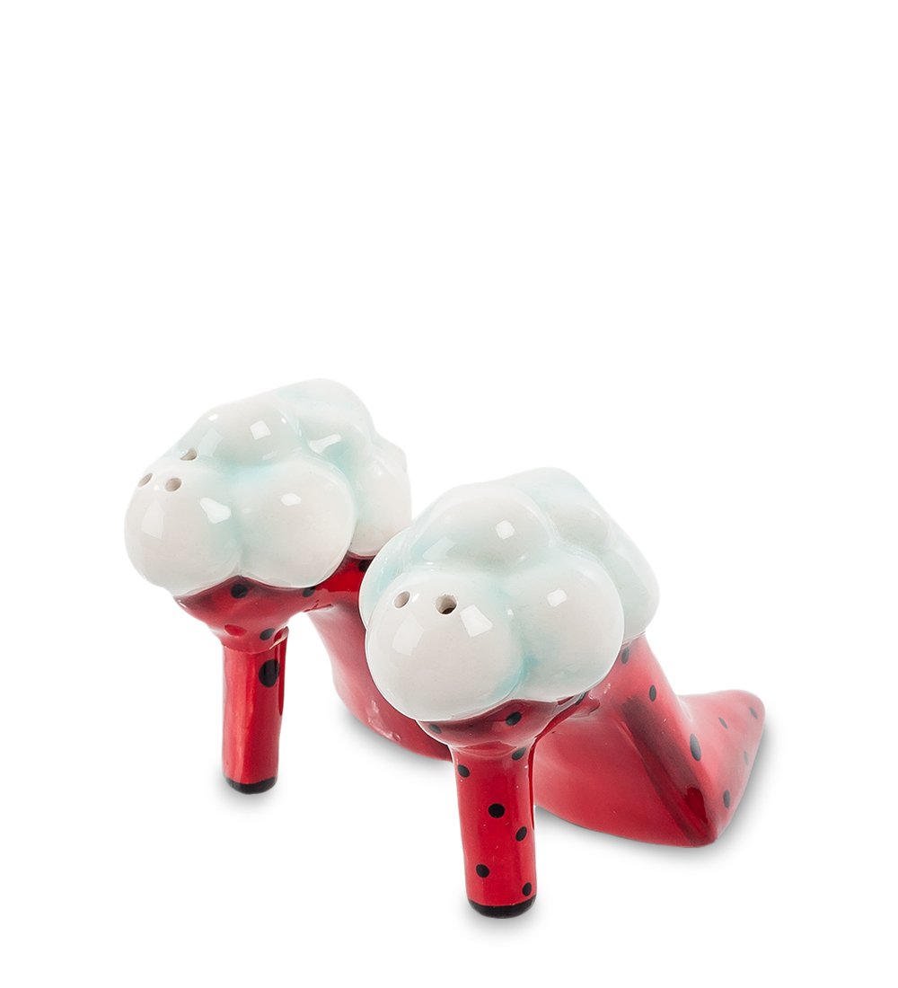 Ну, кто додумался до такого – поставить туфли на обеденный стол?! Понятно, что они красивые, модельные, яркие, но не место им среди тарелок и блюд с едой. А вот и нет – самое место. Присмотритесь: эти ярко-красные туфельки с черными крапинками на самом деле являются емкостями, в которых хранятся соль и перец. Есть и дырочки, через которые можно посолить и поперчить любое блюда – придать ему пикантность, как эти туфли делают своим присутствием пикантным обыкновенный обед. Подарите такой столовый набор женщине, которая стремится одеваться модно – пусть удивляет своих гостей, подавая на стол модельные туфли.