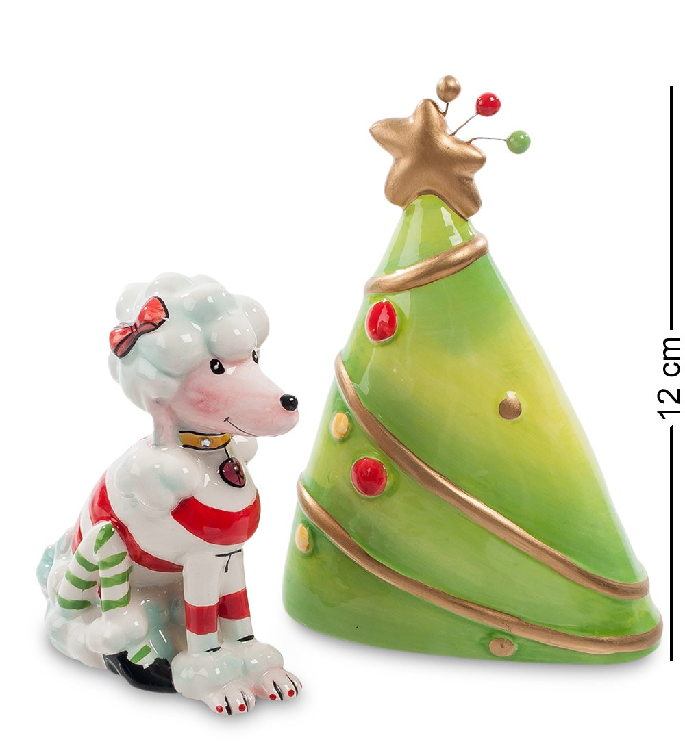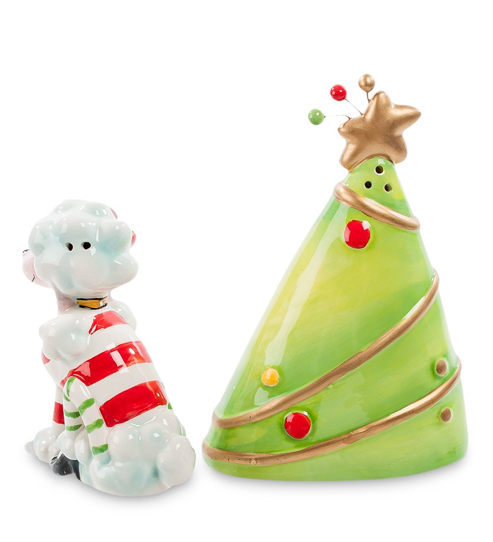 Этот набор для использования за столом соли и перца рассчитан на новогодний праздничный стол. Ведь входящая в него солонка представляет собой стилизованную новогоднюю елочку с разбросанными по ней шарами и гирляндами и с золотой звездой на верхушке. Второй же аксессуар, предназначенный для перца, - забавный песик-пудель, которого после стрижки раскрасили в красно-белые полосы. Можно сказать, что экстравагантность его вида соответствует остроте содержимого перечницы. Во всяком случае, гостей такой набор на праздничном столе явно не оставит равнодушными и придаст оригинальности празднику.