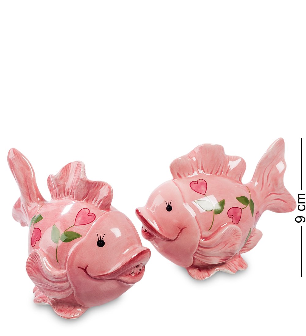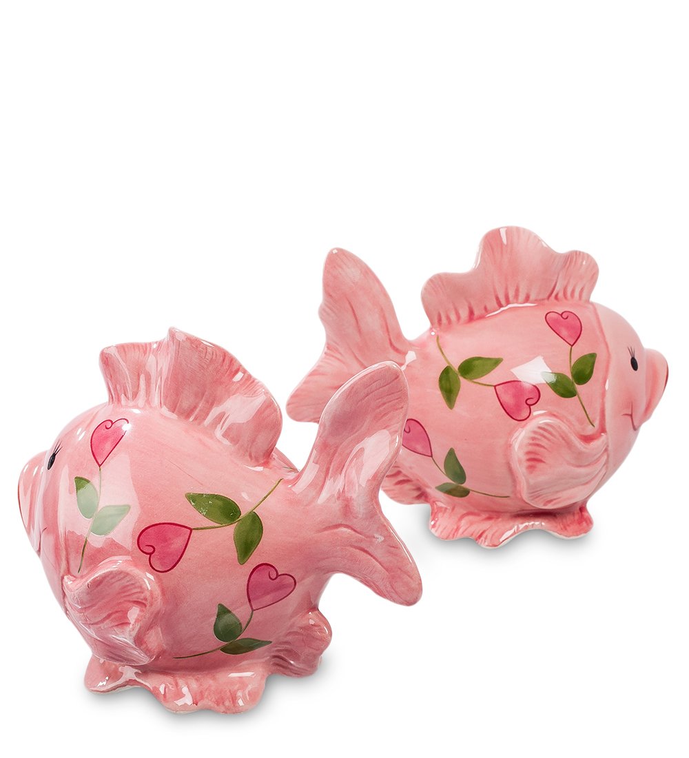 Керамический набор выполнен в виде двух милых влюбленных рыбок, которые готовы делиться своей любовью со всеми окружающими. Рыбки, обладающие шикарными улыбками, расписаны розовыми красками и украшены романтичными сердечками, что делает этот набор незаменимым аксессуаром в доме, где живет любовь.