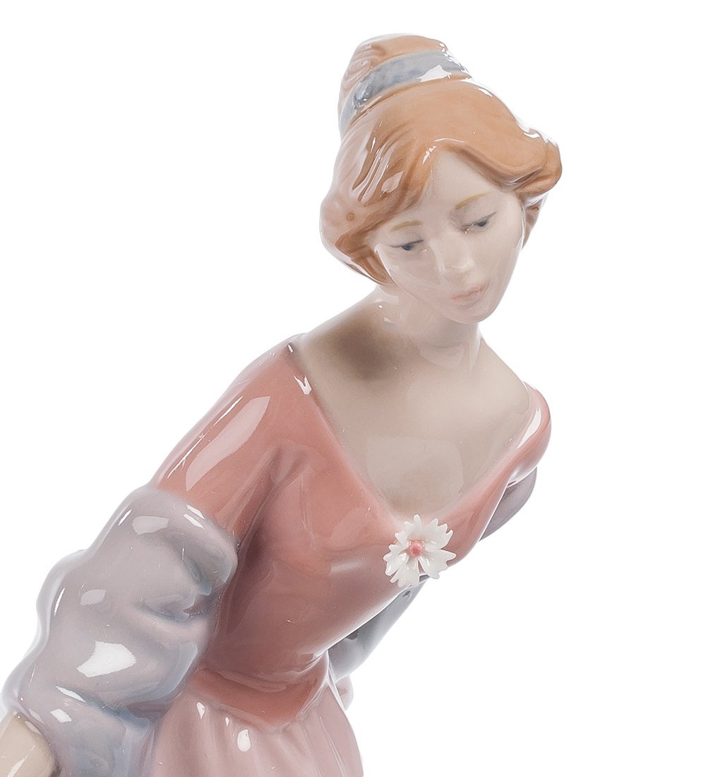 Девушка в длинном платье чуть придерживает его полы, чтобы оно не мешало идти. Это явно не одежда на каждый день, хотя никаких украшений, кроме единственного белого цветка, на платье нет. Да и зачем они этой девушке, если ее главным украшением является собственная красота и скромность. Это – настоящая леди, и ее благородство сквозит в каждом движении, не переходя в высокомерие. Кому такой подарок придется кстати? Юной девушке, впервые вышедшей в свет, как напоминание о том, что она и без любых украшений будет выглядеть лучше всех. Или моднице, которой можно напомнить о том, что держать себя все же надо поскромнее.