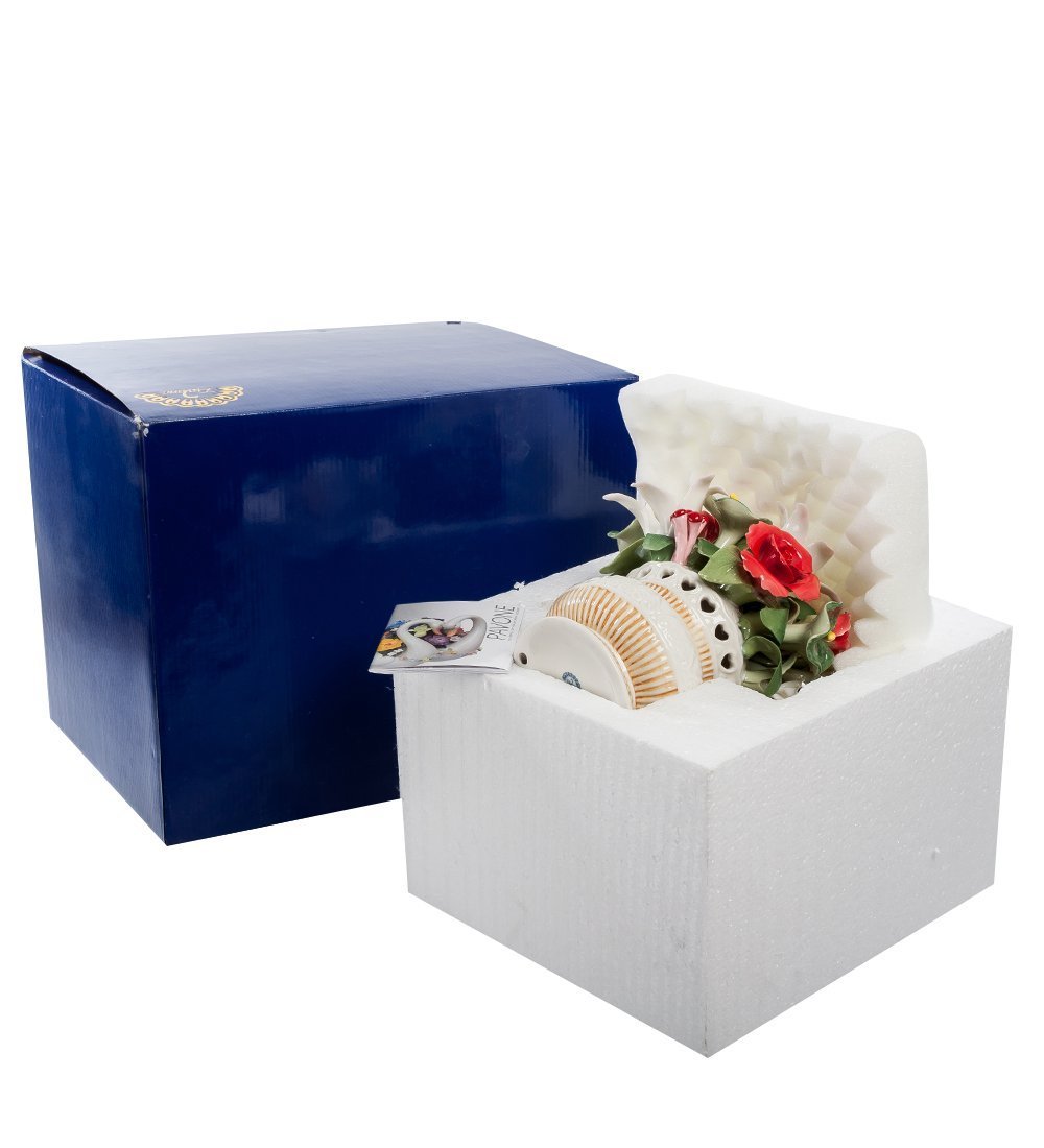 Эта белая узорчатая ваза своим мягким рисунком как будто подчеркивает яркость цветов, которые в нее поставлены. А букет радует своим изобилием красок: ослепительно-белые, бардово-красные, нежно-розовые цветы самых разных видов создают продуманную композицию, способную доставить эстетическое удовольствие. И не верится, что цветы эти – не живые, срезанные только что, а изготовленные из тончайшего фарфора. Такая корзина разве что не пахнет цветами, зато свежей останется не один год. Приятно дарить живые цветы, но почему бы и не вручить такой вечный букет, если он не менее красив, чем настоящий?
