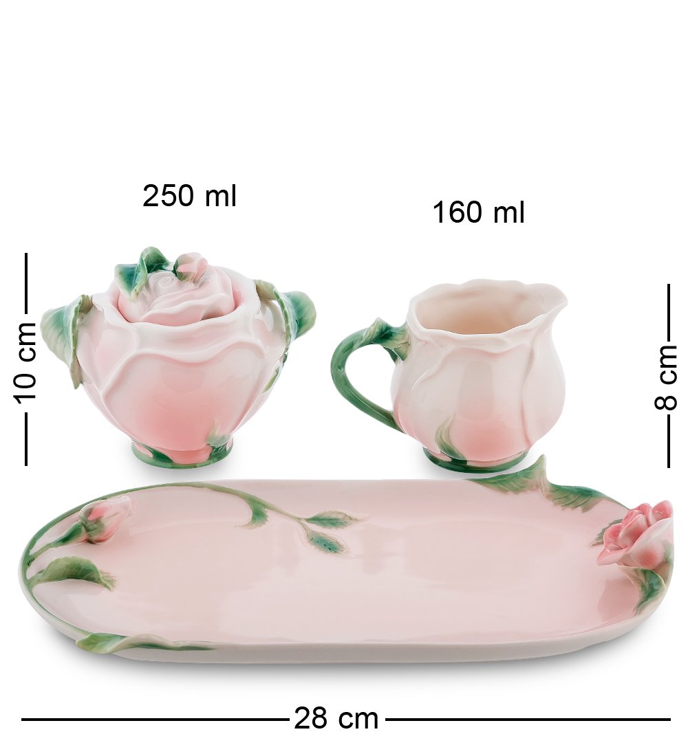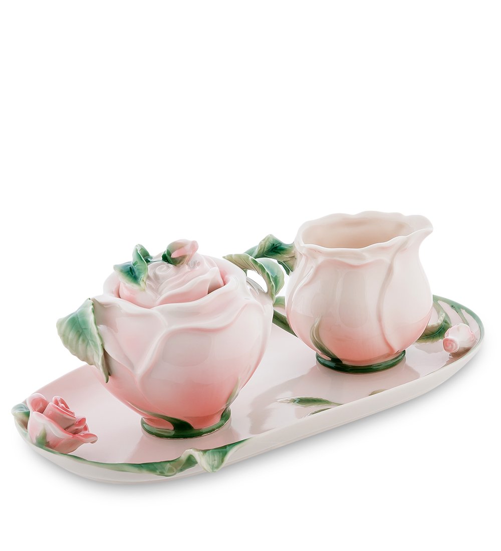 На изящной подставке с оригинальными цветочными элементами поместились две свежие шикарные розы. Это — сахарница и молочник, которые вместе составили великолепную композицию. Все три предмета перекликаются по форме, цветовой гамме, цветочным элементам, и составляют идеальное трио, которое станет украшением любого стола.