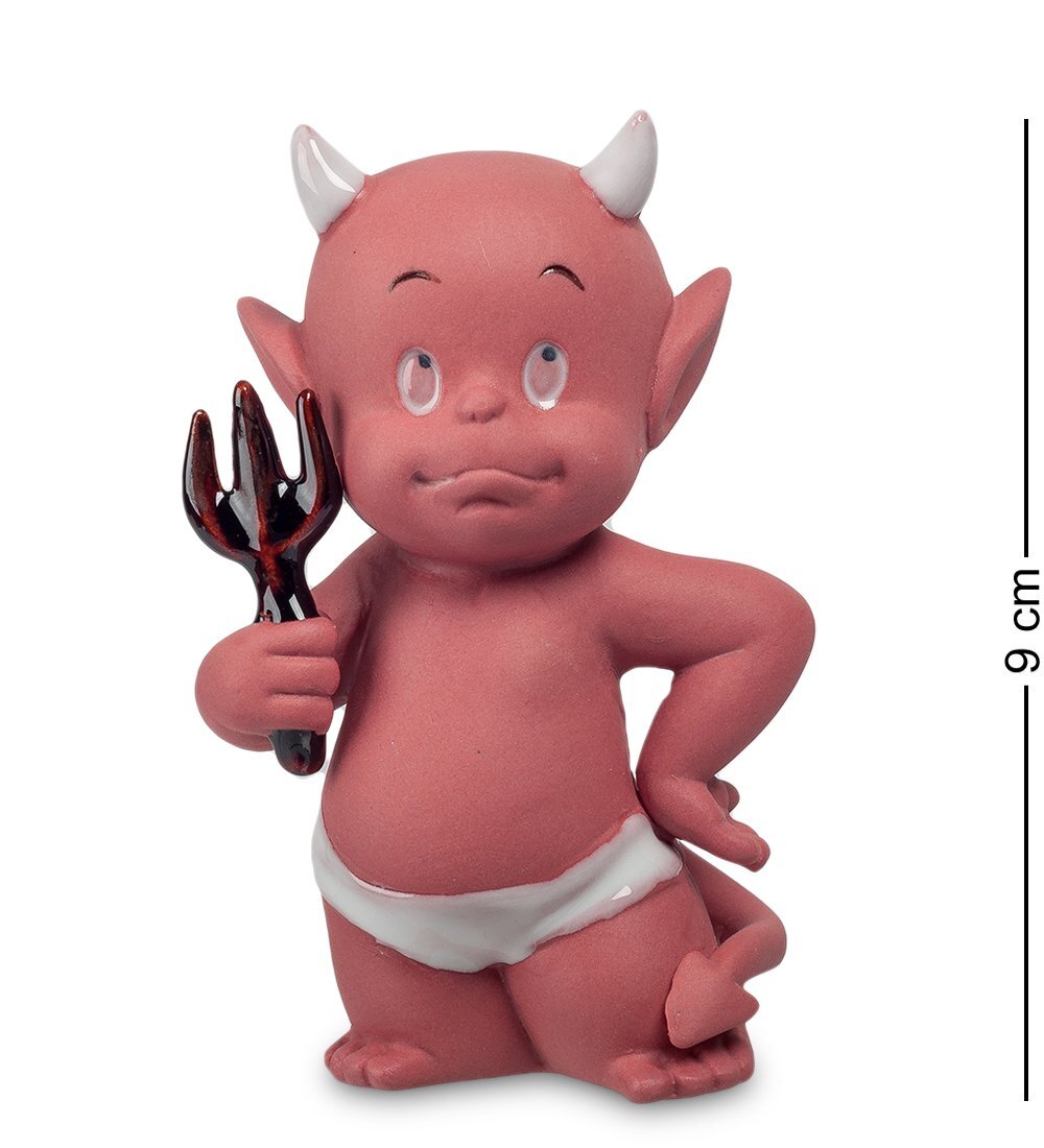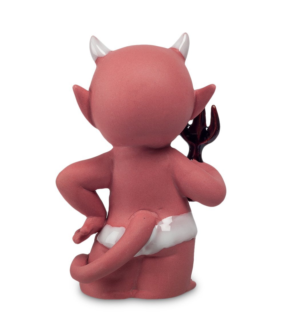 Чертик сделан из фарфора и покрашен в цвет красной глины. На его голове – маленькие белые рожки; он совсем не страшен и выглядит так, как выглядит любой другой ребенок. О демоническом происхождении говорит лишь длинный хвост со стрелой, а также вилы, которыми черти обычно переворачивают грешников на сковородах.