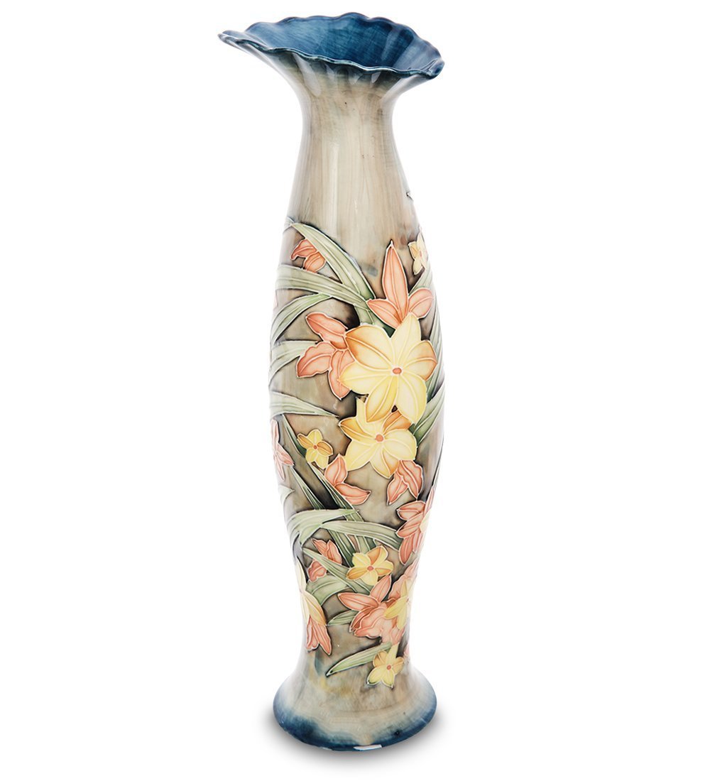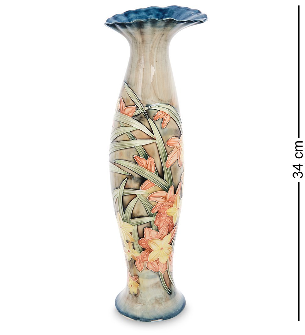 Композиция из цветов, которая украшает вазу, настолько идеально вписывается в силуэт вазы, что нереально представить ее без этих декоративных элементов. Кроме цветовой гаммы, она привлекает внимание своей необычной формой. Верх вазы своими формами напоминает створки морской раковины, что делает ее еще более неординарной.