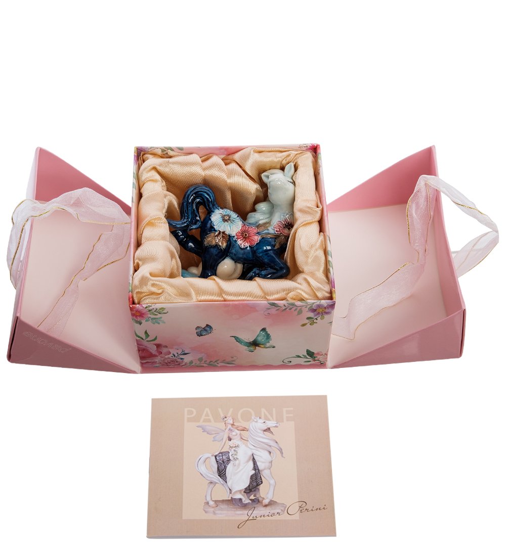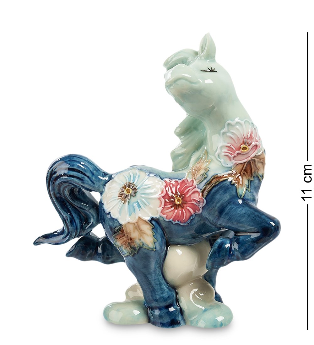 Такие лошади бывают только в воображении. Представьте себе лошадку, как будто одетую в джинсы – вся нижняя часть ее тела вместе с хвостом окрашены в яркий синий цвет. Верхняя же половина – белая с легким голубым оттенком. И по всему корпусу – цветы, белые, розовые, огромных размеров, зеленые листья, как будто лошадка живет в огромном букете из ярких цветов.