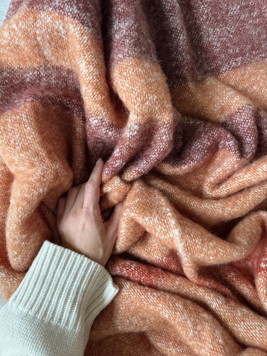 Мохеровый плед Over Horizon раскрывает историю света, тепла и тихого созерцания. Его палитра ритмично переходит от теплого терракотового до светлого с медовым оттенком. Контрастные полосы создают спокойный, выверенный ритм и ощущение визуального баланса — словно горизонт, растворяющийся в мягком рассеянном свете.