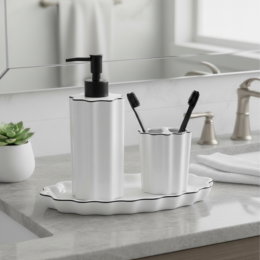 На подставке для ванных принадлежностей удобно разместятся стакан для зубных щеток и диспенсер для жидкого мыла или банка для хранения из коллекции Camellia. Это позволит разумно организовать пространство и объединить аксессуары в гармоничную композицию.