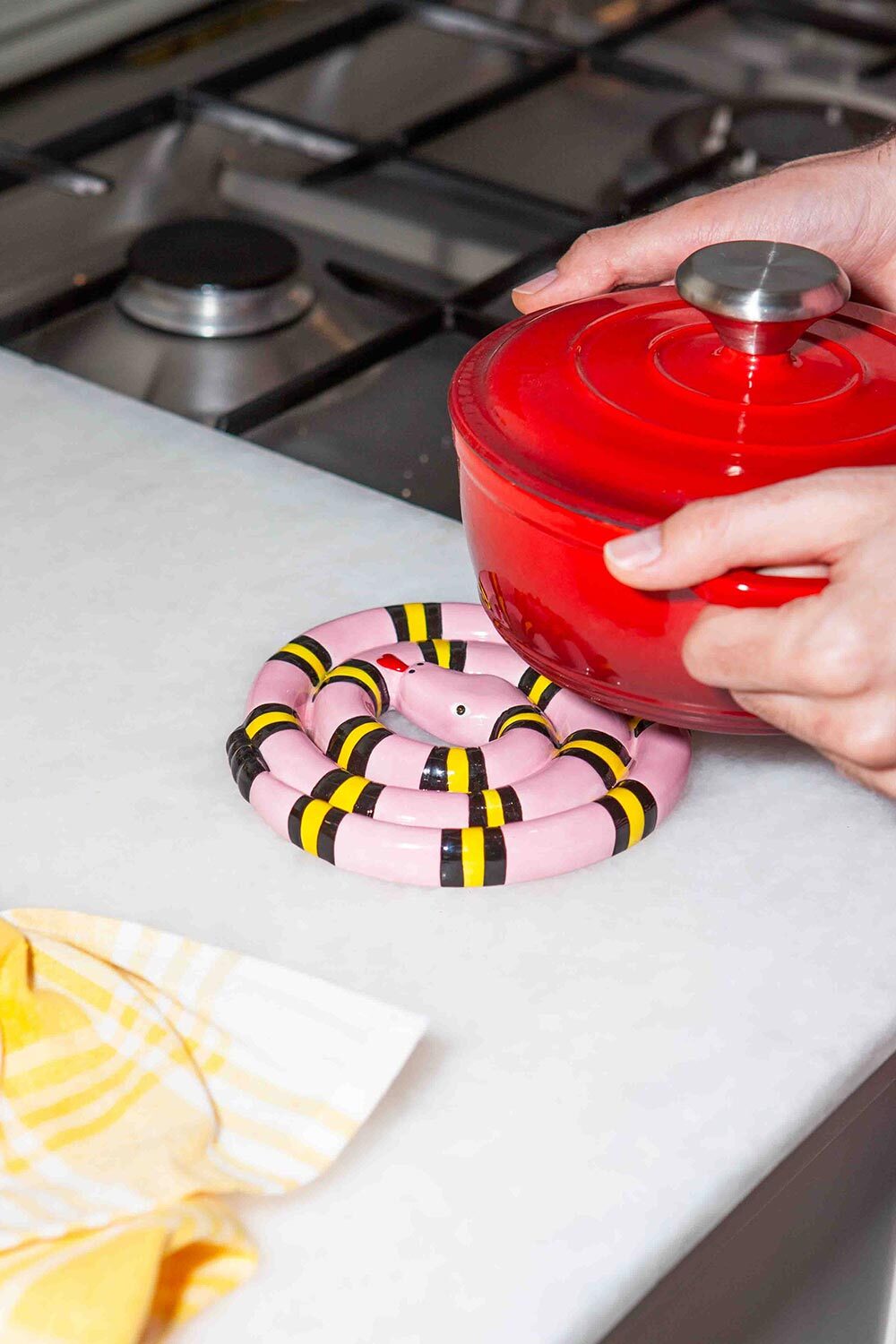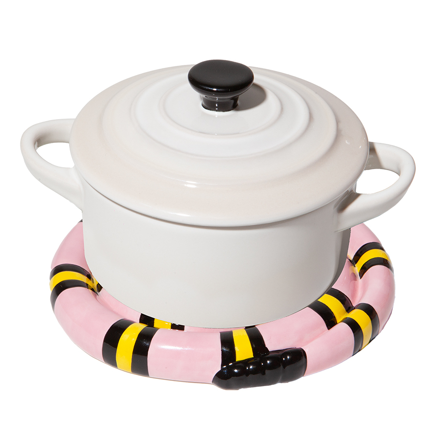Забавная керамическая подставка Snake станет тихим стражем вашего стола, оберегая его поверхность от жарких следов чайника или сковороды. В её округлой форме и плавных линиях нет ни капли агрессии — лишь гармоничная геометрия и скульптурная завершенность. Эта подставка не только физически защищает стол, но и символически охраняет пространство вашего очага.