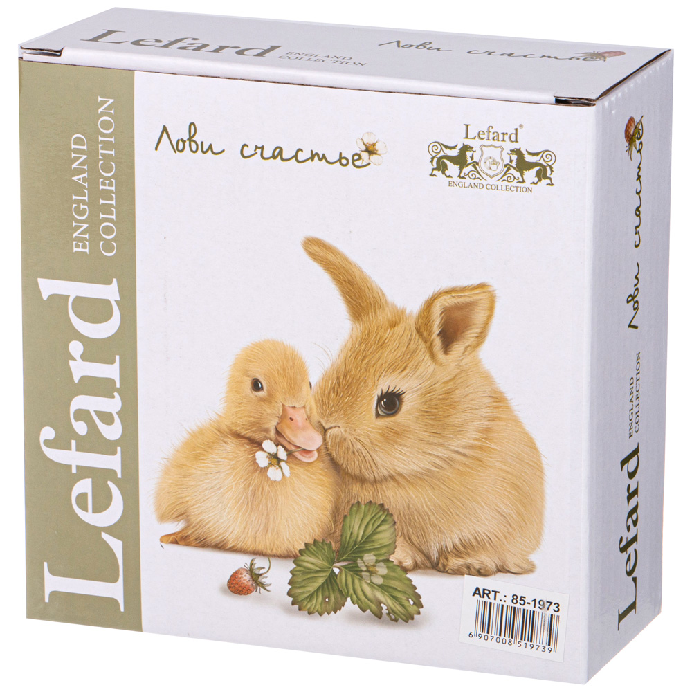 Наша жизнь состоит из маленьких мгновений счастья. Поймал это мгновение и наслаждайся! Только любовь и только доброта сделает мечты реальными. Пушистые крольчата и задорные утята заставят улыбнуться и согреть любовью родных и близких. ТМ LEFARD коллекция «Лови счастье» - это лучший подарок самым дорогим и любимым. Кружки, чайные пары, тарелки и салатники выполнены на тонкостенном высококачественном фарфоре. Удобные формы и размеры. Красочная упаковка. Продукция прошла сертификацию, безопасна для контакта с пищевыми продуктами. Можно использовать в микроволновой печи, мыть в посудомоечной машине.