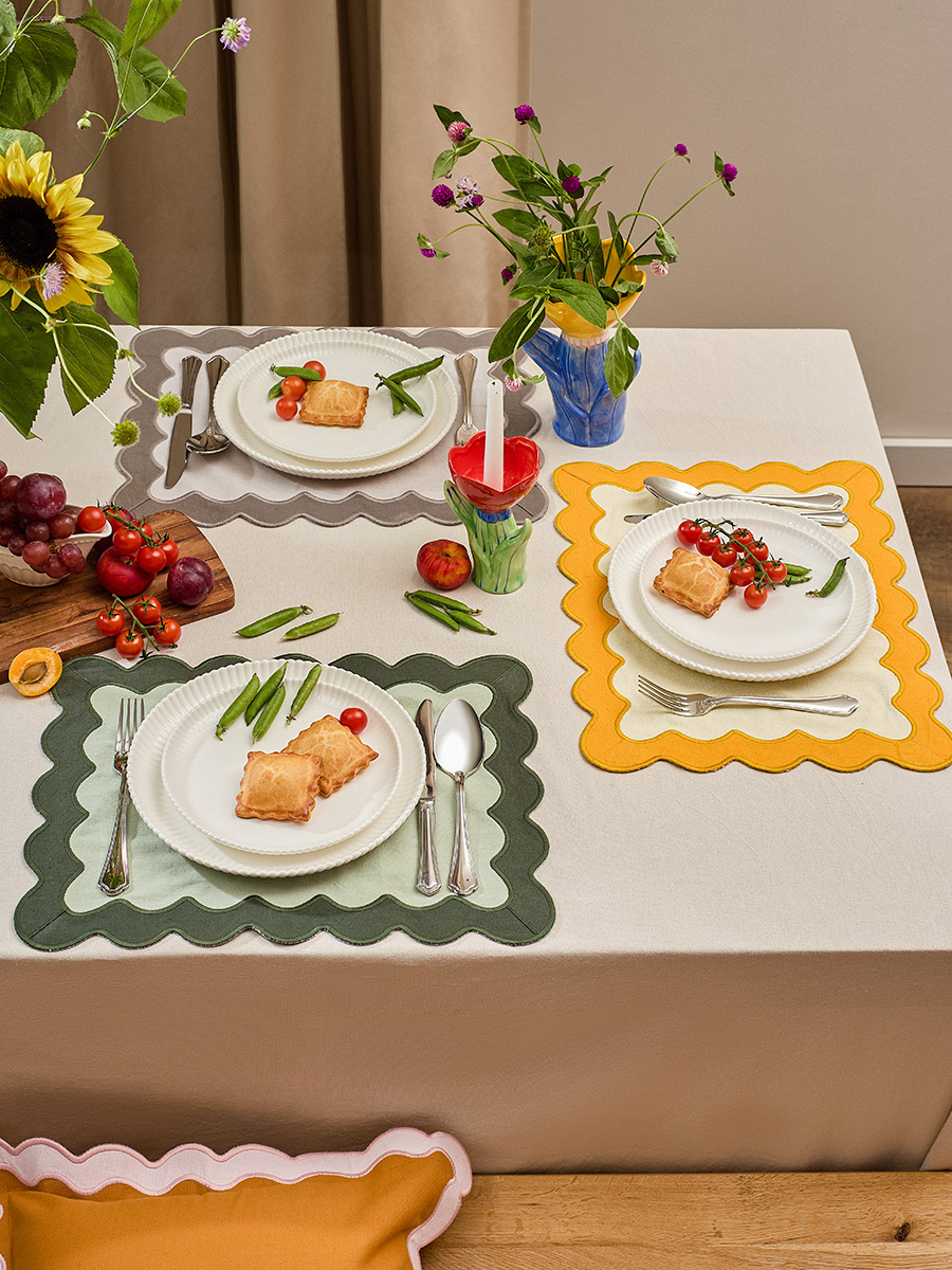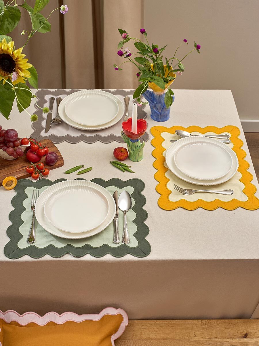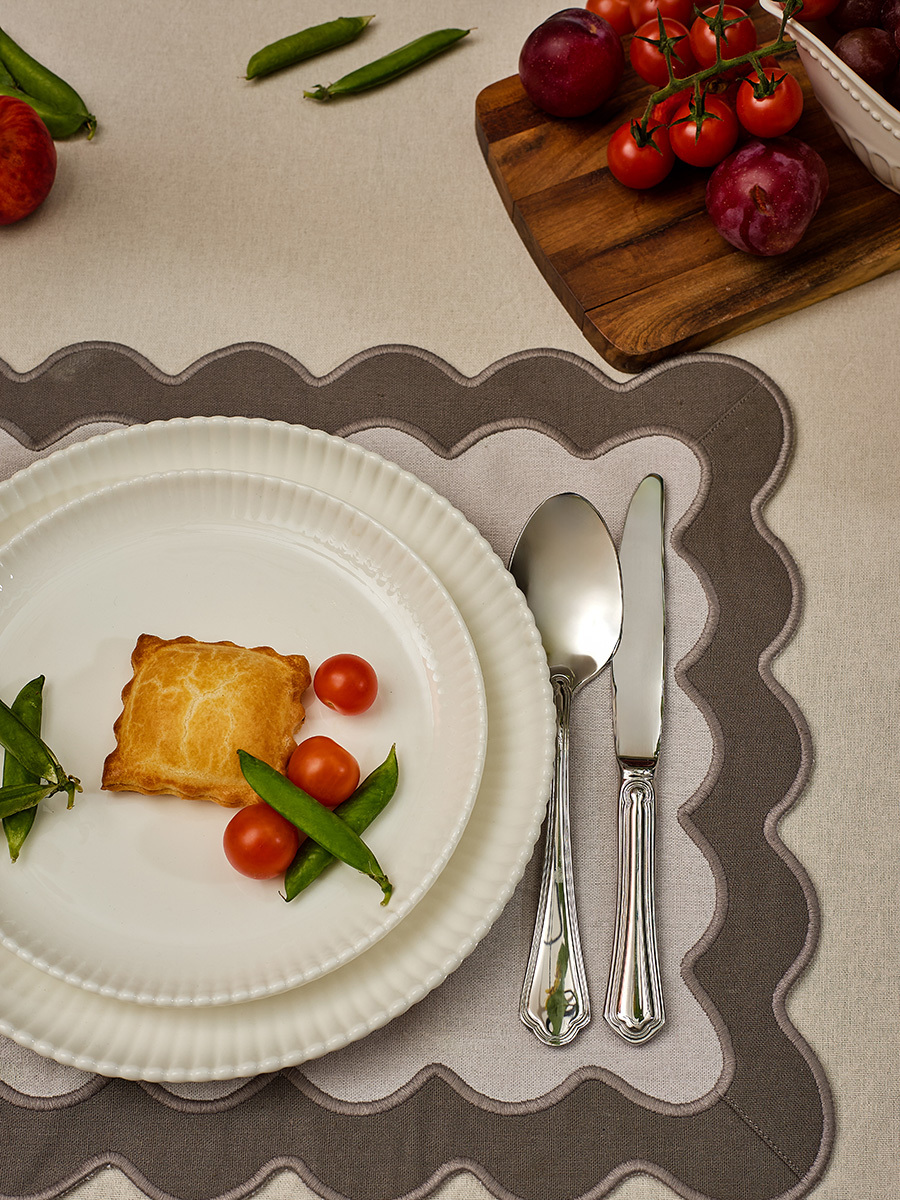 Салфетка под приборы с контрастным кантом серого цвета из коллекции Trendy Ruffles сделает любую сервировку стильной, позволив экспериментировать с текстурами и формами. Текстиль с волнистой отделкой, напоминающей изящные раковины морских гребешков, стал ярким элементом стиля Ар Деко – и сейчас возвращается в моду, появляясь в самых актуальных интерьерных решениях.