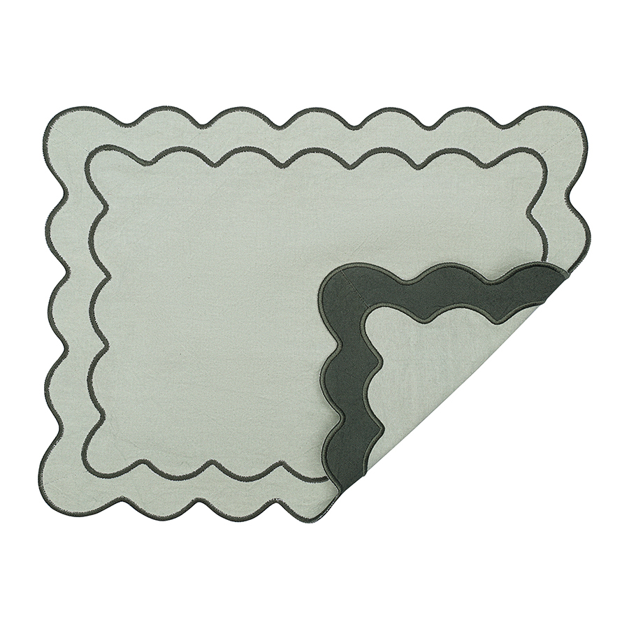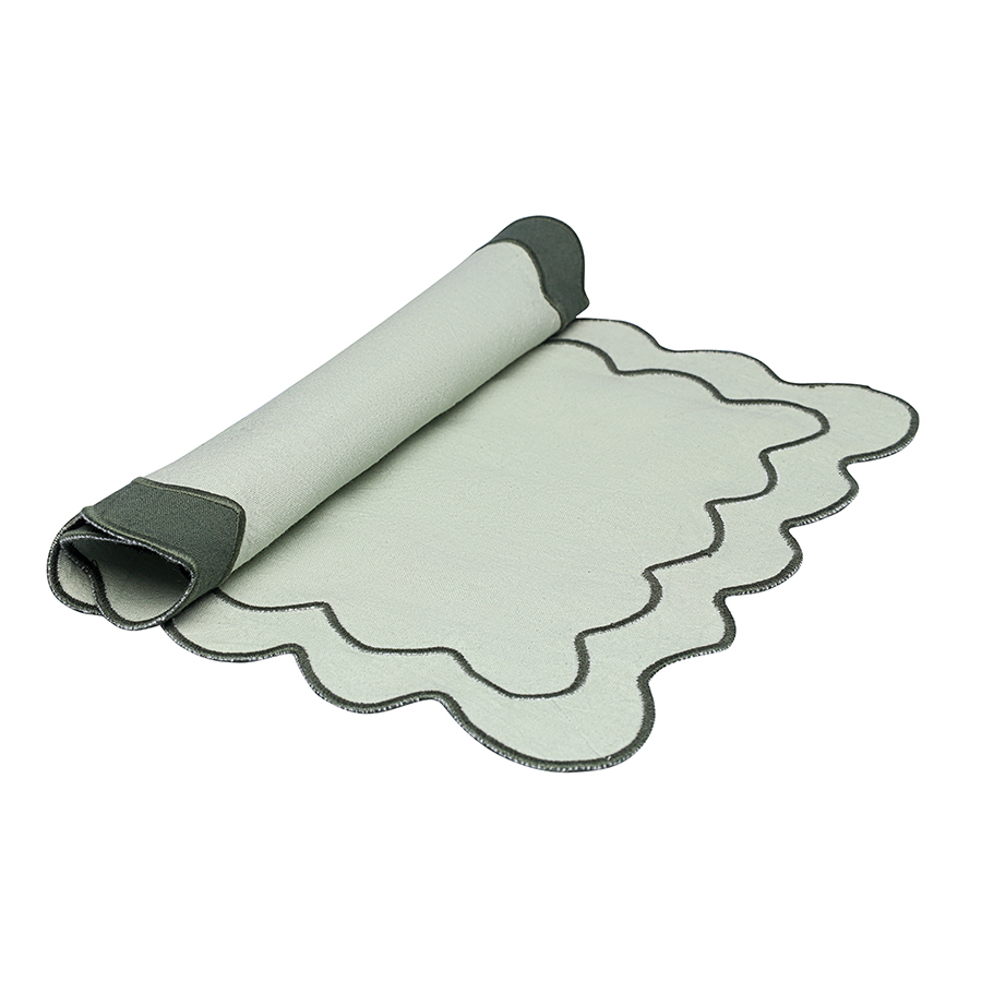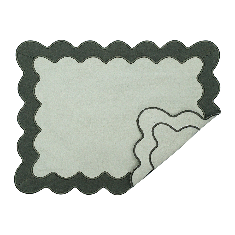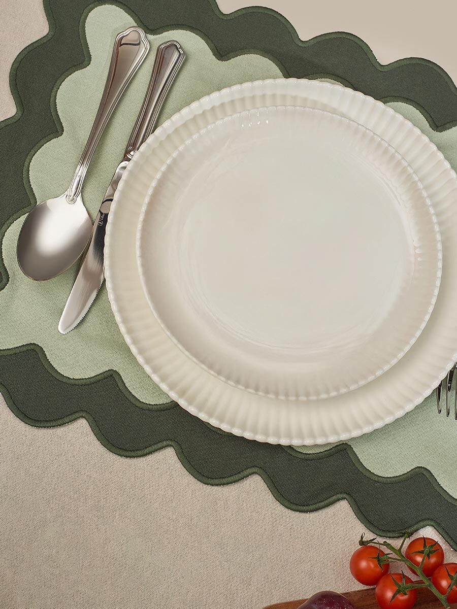 Салфетка под приборы с контрастным кантом зеленого цвета из коллекции Trendy Ruffles сделает любую сервировку стильной, позволив экспериментировать с текстурами и формами. Текстиль с волнистой отделкой, напоминающей изящные раковины морских гребешков, стал ярким элементом стиля Ар Деко – и сейчас возвращается в моду, появляясь в самых актуальных интерьерных решениях.