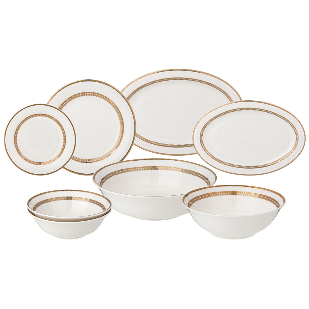 ТМ LEFARD Сервиз столовый "Праздничный" для торжественных застолий и семейных обедов. Изысканный фарфор Bone Pocelain с эффектом костяного фафора, тонкий и полупрозрачный, прочный и никогда не темнеет. Классический рельефный орнамент в виде сетки выглядит объемным и привлекательным. Пересекающиеся линии уходят в бесконечность. Состояние движения подталкивает к движению вперед, наполняя энергией. Изящный золотой кант придает блеск и торжественность. Эта посуда замечательный подарок на юбилей, день рождения, новоселье, который наверняка пригодится каждой семье, запомнится навсегда и прослужит долгие годы. Дизайнеры торговой марки предлагают чайный сервиз и наборы тарелок и чайных пар, чтобы сформировать полную сервировку стола предметами коллекции на 6 или 12 персон.