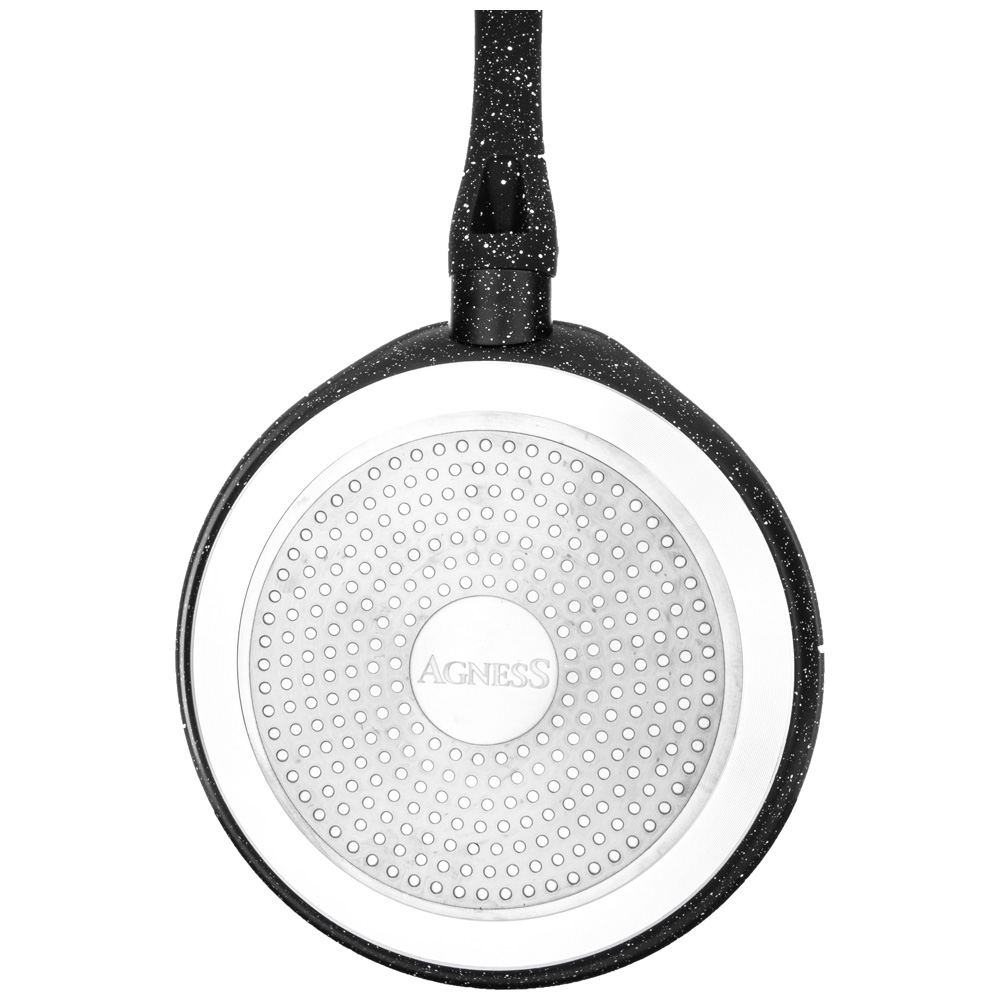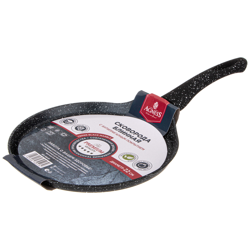 СКОВОРОДА БЛИННАЯ AGNESS С АНТИПРИГАРНЫМ ПОКРЫТИЕМ "BLACK MARBLE" - это идеальный выбор для тех, кто ценит удобство и функциональность в посуде. Одним из главных достоинств этой сковороды является ее антипригарное покрытие, которое позволяет готовить без использования большого количества масла, а также обеспечивает равномерное распределение тепла. Благодаря этому, продукты готовятся быстрее и сохраняют свои полезные свойства.Быстрое нагревание сокращает время приготовления и сохраняет вкус и аромат продуктов. Многослойная структура покрытия обеспечивает превосходные эксплуатационные качества и увеличивает срок службы, не содержит PFOA.Эргономичная ручка из бакелита с мягким покрытием SOFT TOUCH не нагревается и не плавится, обеспечивает безопасное использование сковородки в процессе приготовления пищи. Посуда AGNESS - это современный дизайн и новейшие технологии производства.
