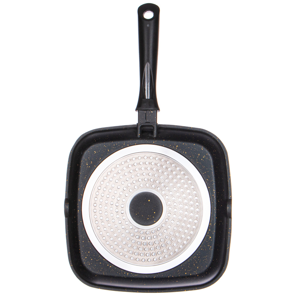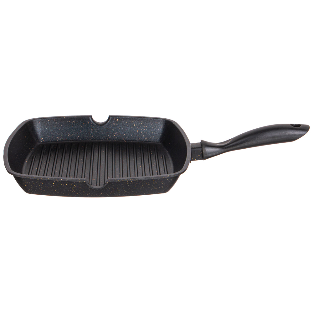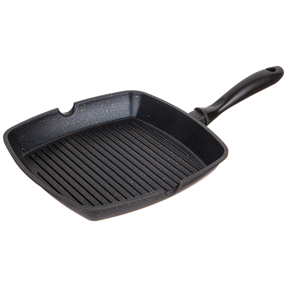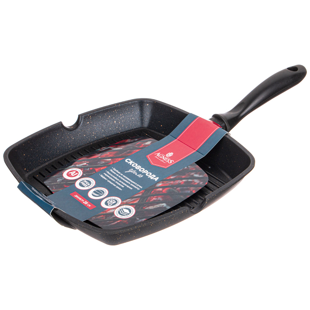 Сковорода-гриль AGNESS с "мраморным" антипригарным покрытием - Ваш незаменимый помощник на кухне! Сковорода-гриль объединяет несколько функций и позволяет приготовить, барбекю не выходя из дома. Основное отличие этой сковороды – ребристое дно. Продукты готовятся на этих ребрах как на решетке, а лишний сок и масло стекает в бороздки между ребрам, а не пригорает к поверхности продуктов. В результате блюдо получается сочным, но не жирным! А на продуктах формируется аппетитная корочка с характерными полосками как от гриля.