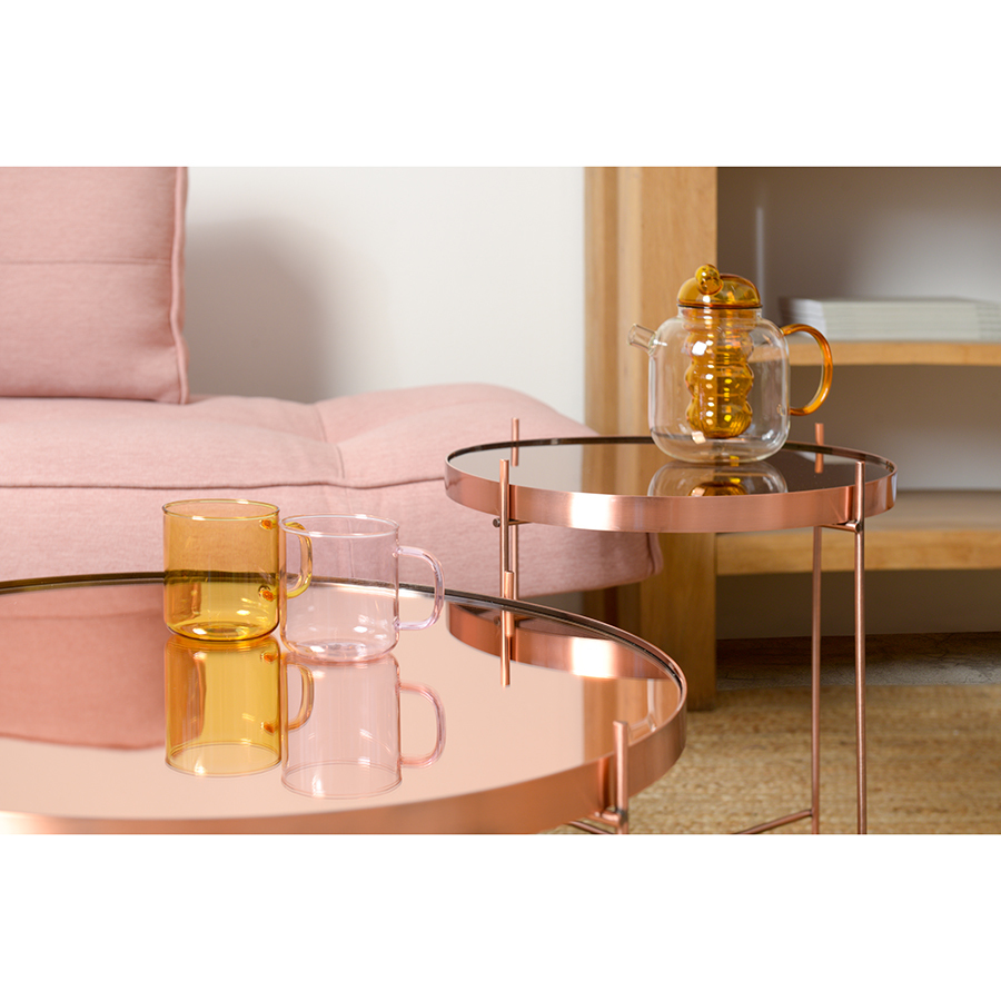 Материалы: столешница – розовое зеркало, каркас – сталь с медным покрытием. Размеры: диаметр – 42,7 см, высота – 43 см.