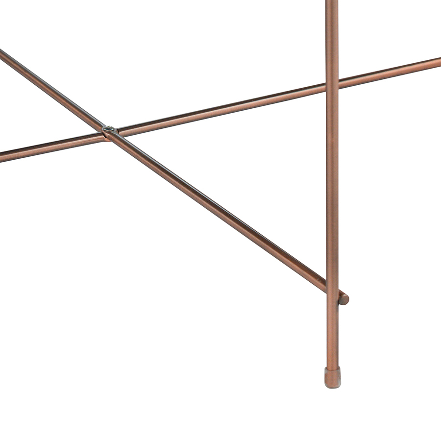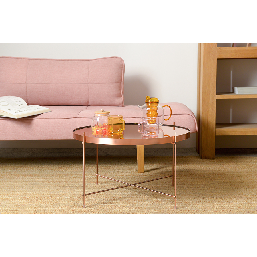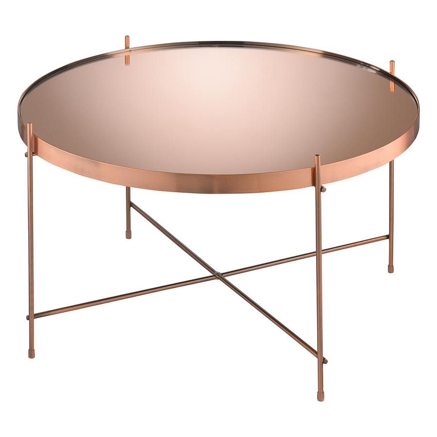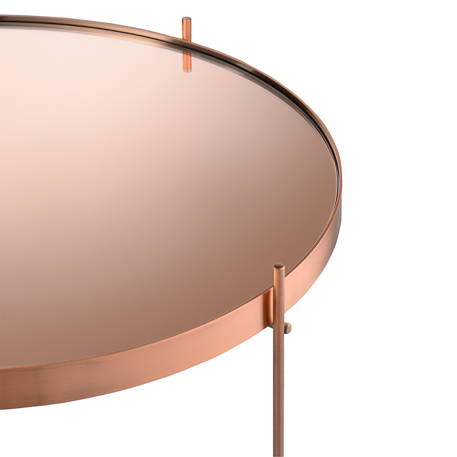 Материалы: столешница – розовое зеркало, каркас – сталь с медным покрытием. Размеры: диаметр – 64,4 см, высота – 38 см.
