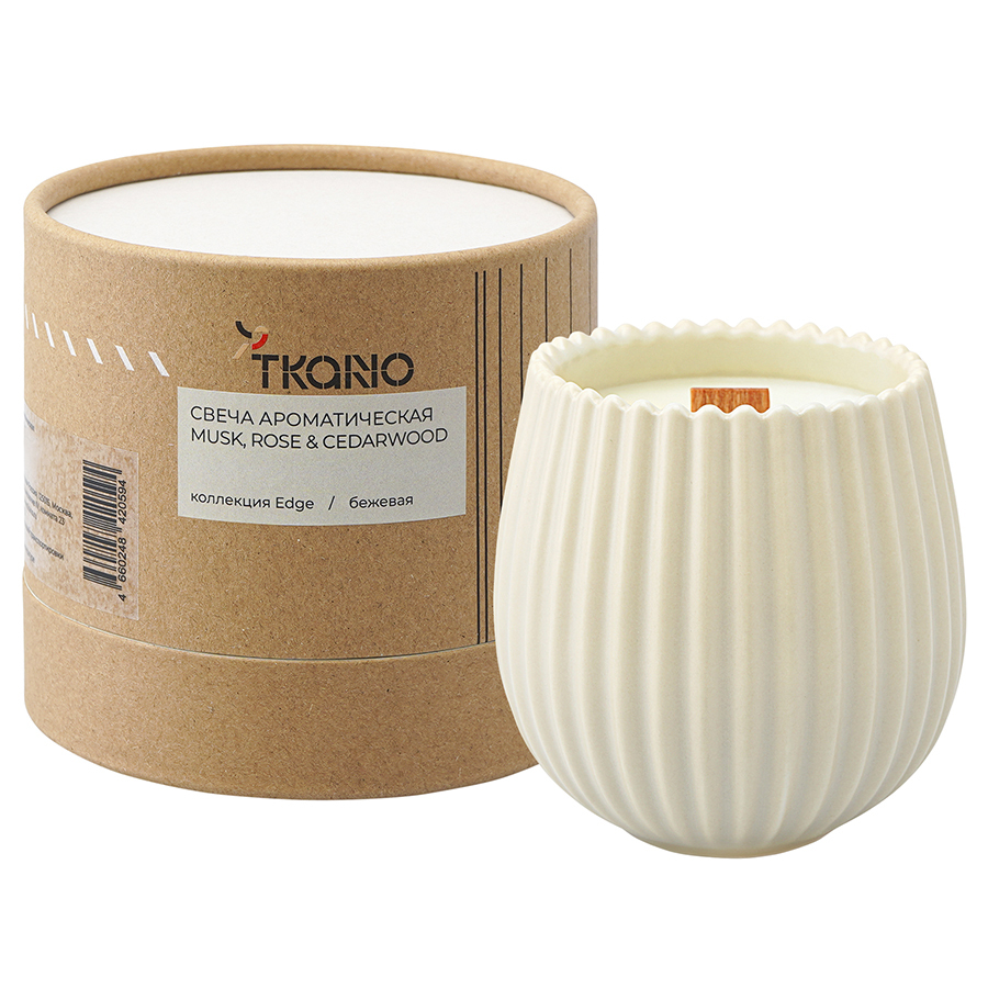 Свеча ароматическая с деревянным фитилем Musk, Rose & Cedarwood бежевого цвета из коллекции Edge с дизайном, вдохновленным русскими традициями, отлично подойдет для домашнего декора и создания в интерьере уютной, расслабляющей атмосферы. Фактурные грани и округлая поверхность фарфорового стакана отсылают нас к образу купола – символу духовного подъема и стремления к совершенству. Экологичные материалы, такие как соевый, кокосовый воск и фитиль из натурального дерева делают свечу безопасной для здоровья и окружающей среды. При горении она не выделяет вредных соединений и не коптит. Однако, во избежание перегрева стакана, рекомендуем не зажигать ее более, чем на 4 часа.