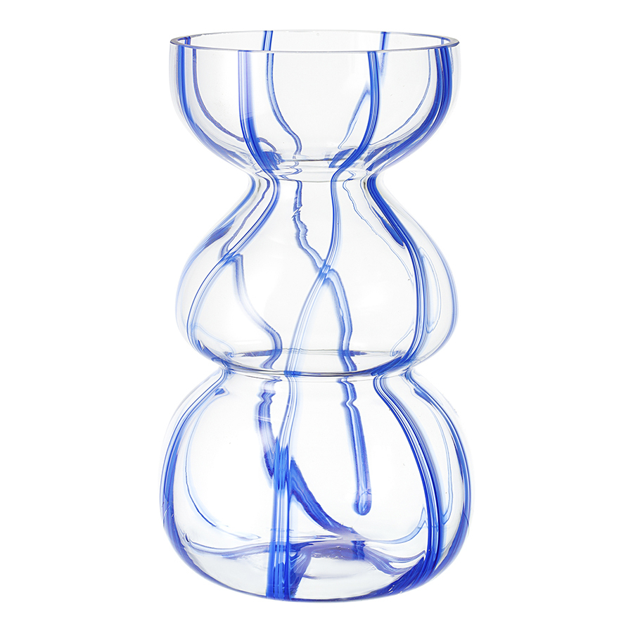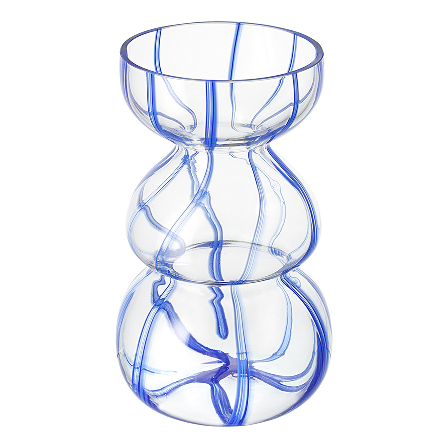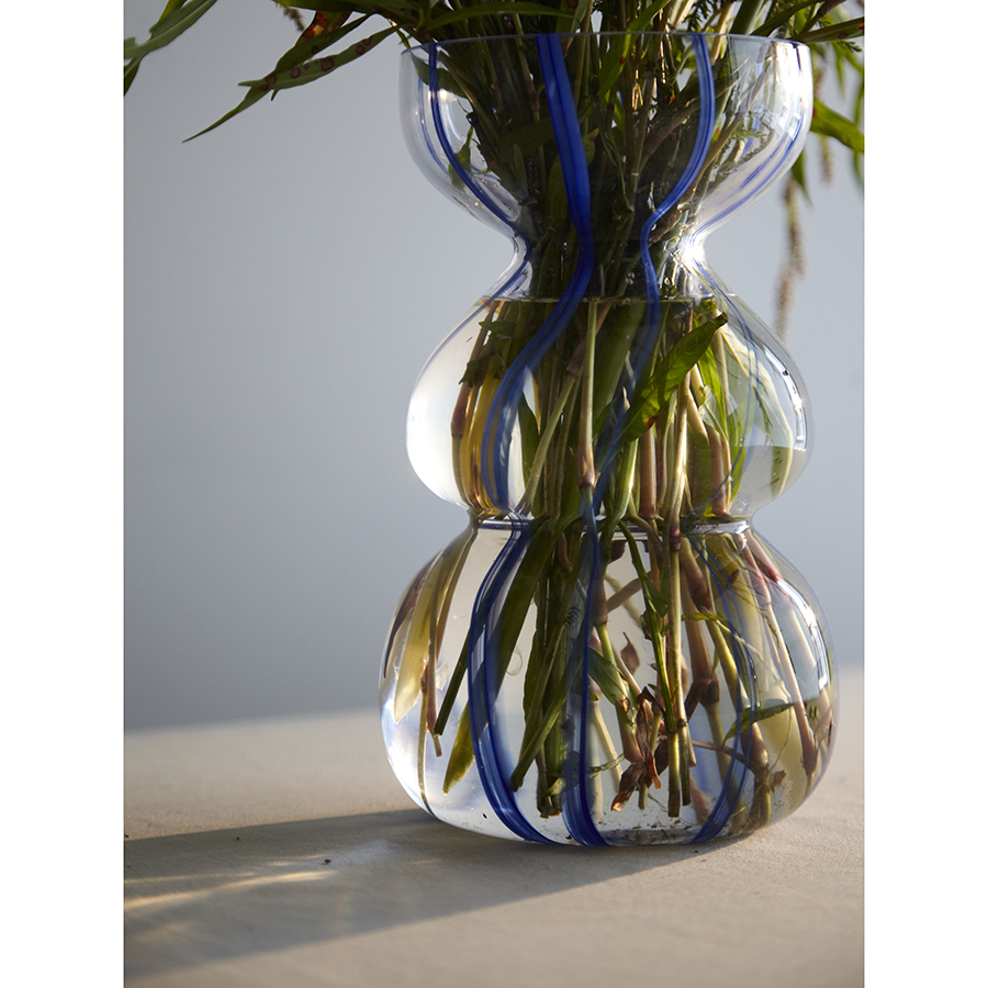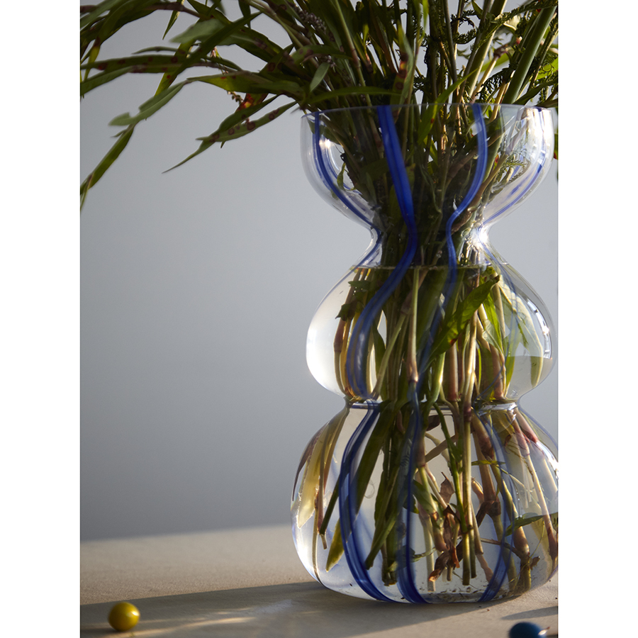 Ваза Marine – привлекательный элемент интерьера, способный оживить пространство за счет своей оригинальной формы и синих полосок, контрастирующих с прозрачным стеклом. Природные мотивы придают ощущение спокойствия и гармонии. Изделие прекрасно подойдет для раскидистых букетов, а также будет идеально сочетаться с ракушками и другими декоративными элементами в морской тематике.