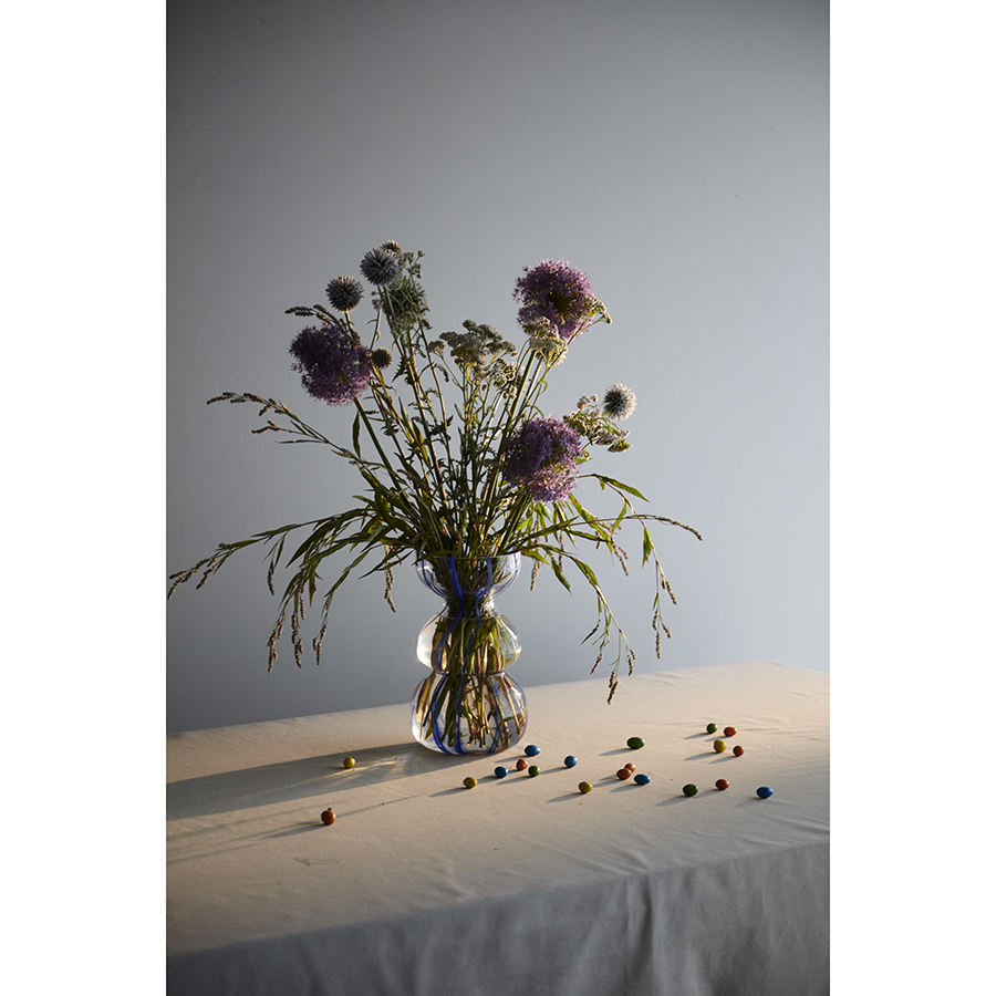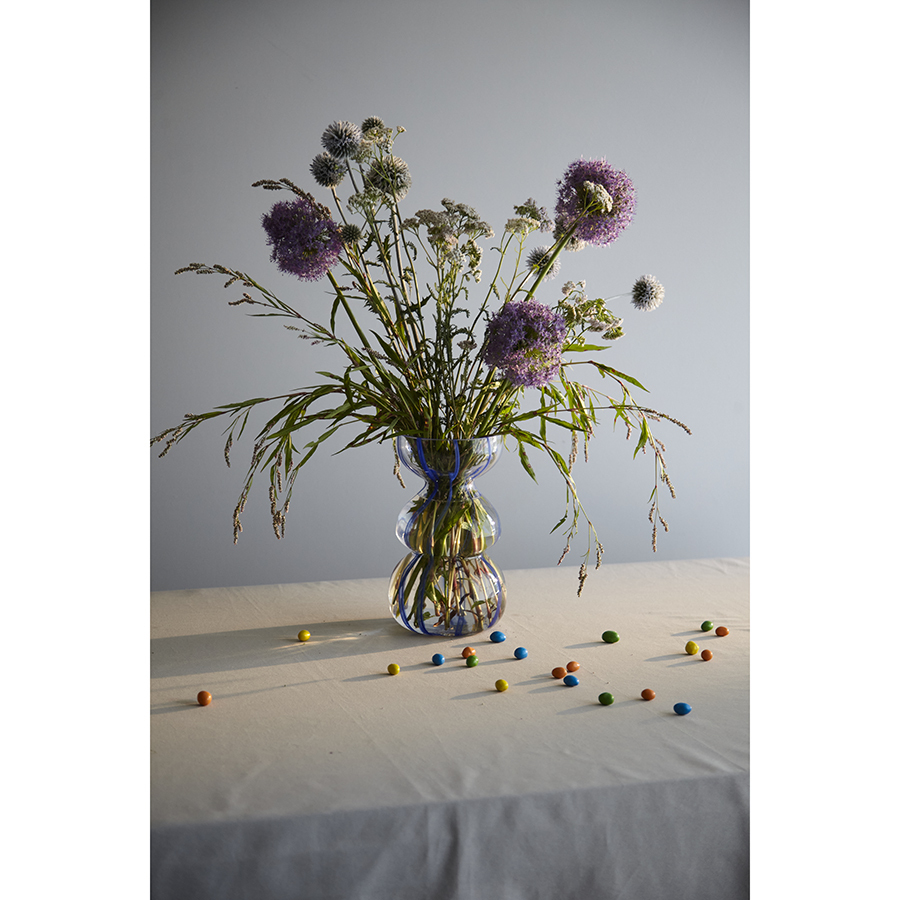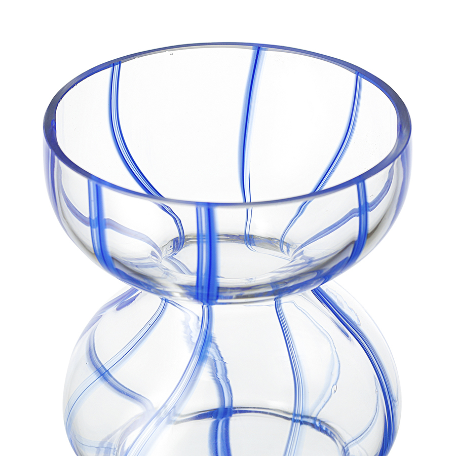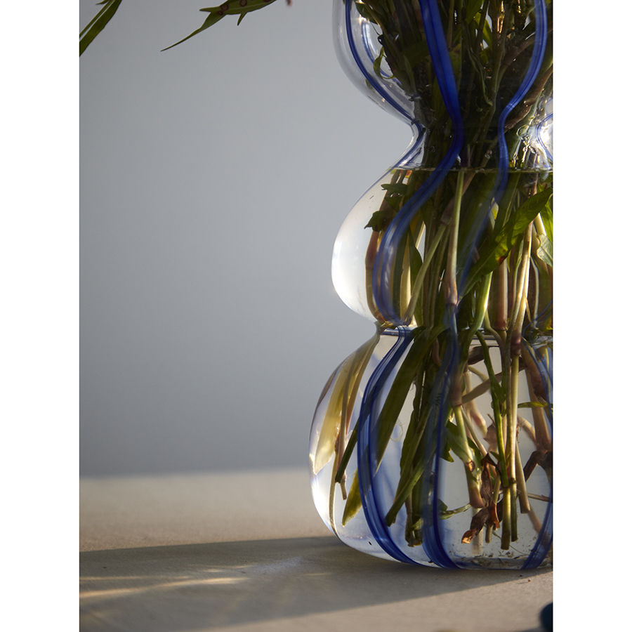 Ваза Marine – привлекательный элемент интерьера, способный оживить пространство за счет своей оригинальной формы и синих полосок, контрастирующих с прозрачным стеклом. Природные мотивы придают ощущение спокойствия и гармонии. Изделие прекрасно подойдет для раскидистых букетов, а также будет идеально сочетаться с ракушками и другими декоративными элементами в морской тематике.