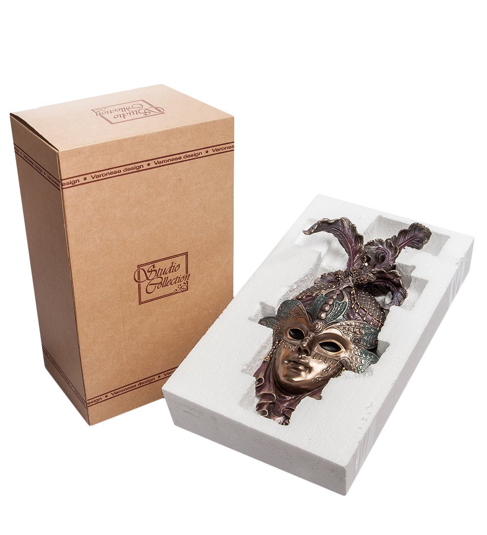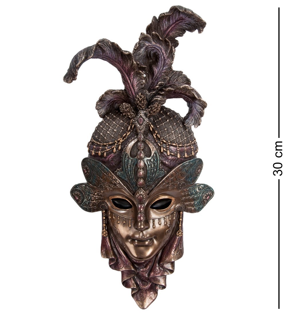 Маска, покрытая бронзовым напылением, украшена ярким и выразительным декором. Сам слепок оформлен в виде крыльев стрекозы, а его верхнюю часть дополняют изящные вкрапления и вставки из перьев. Но, несмотря на столь богатый декор, маска «Стрекоза» выглядит очень изящно и элегантно, поэтому она гармонично впишется в любой интерьерный стиль.