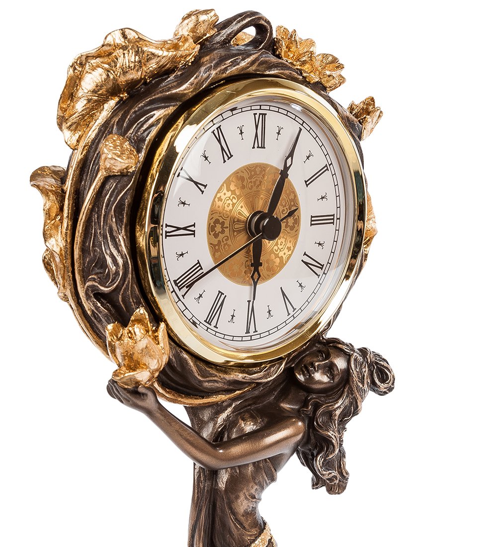 Часы «Девушка и лотусы», оформленные в старинном стиле – предмет, который отлично впишется в старинный интерьер, станет частью композиции, состоящей из предметов, созданных несколько веков назад.