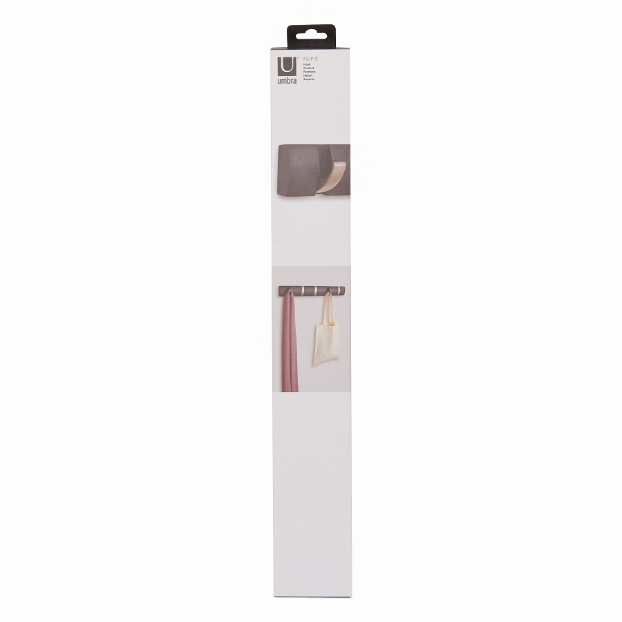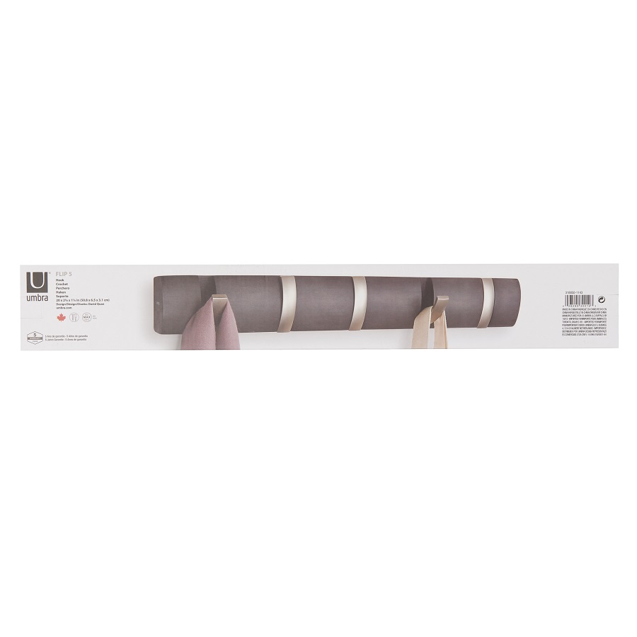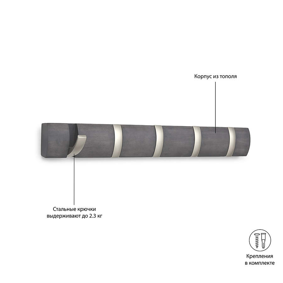 Вешалка имеет 5 откидных крючков из никеля: когда они не используются, их можно легко сложить. Каждый крючок выдерживает вес до 2,3 кг. Поставляется с подробной инструкцией по установке и необходимым монтажным оборудованием.